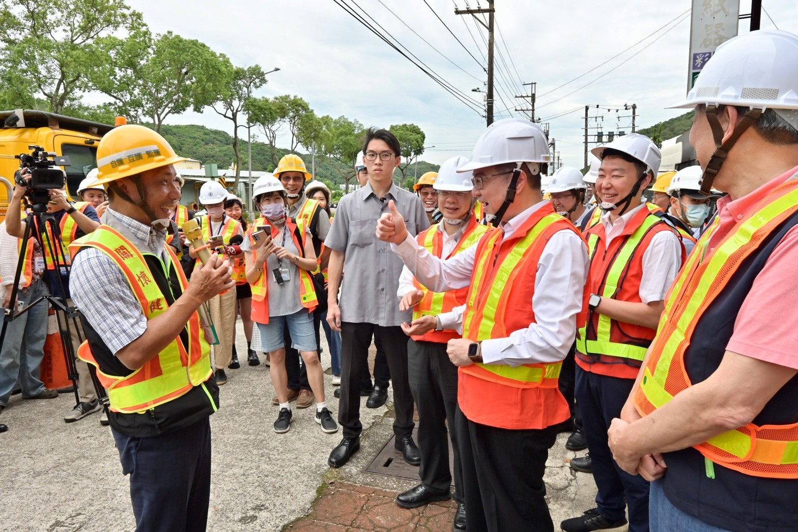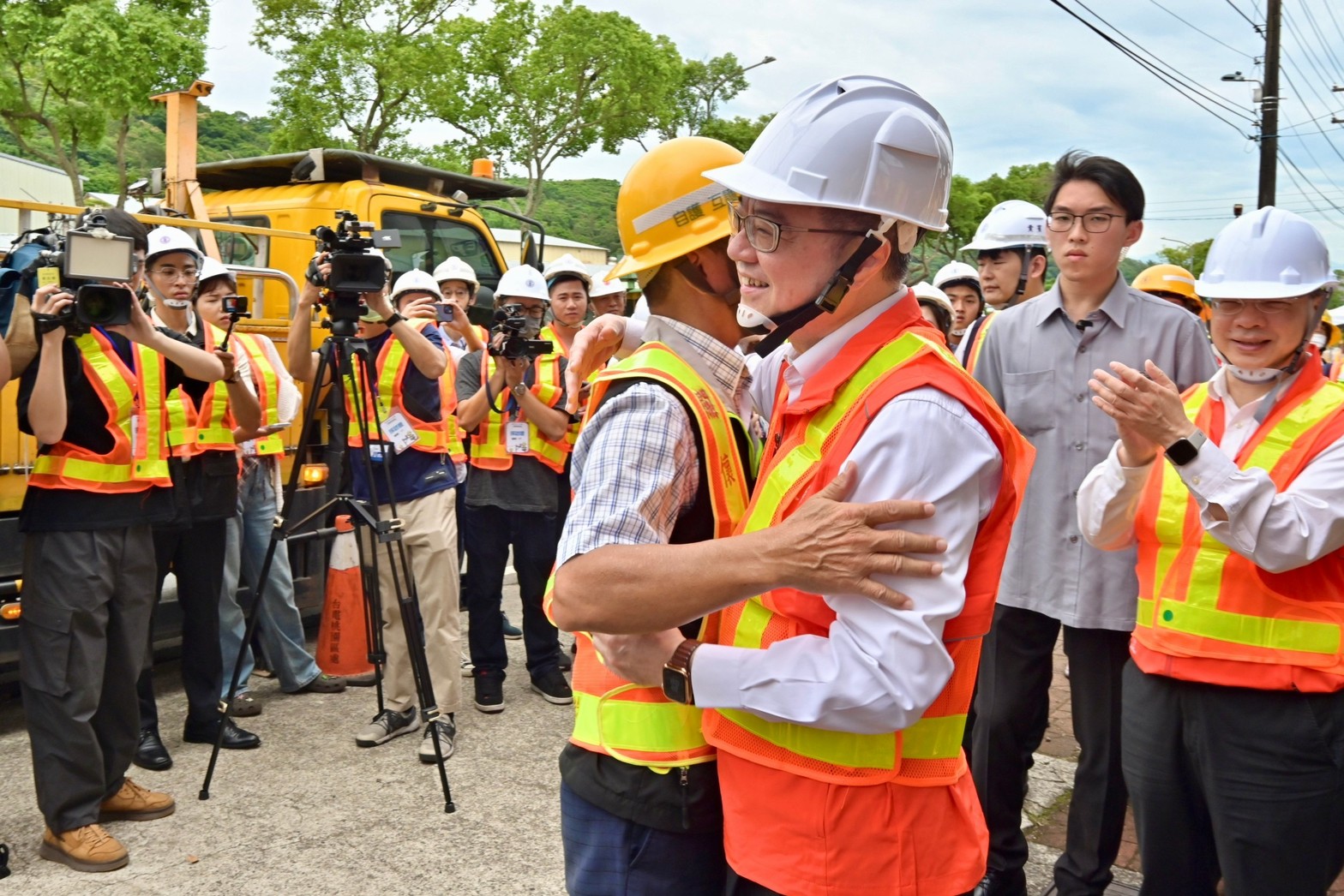 致詞結束後,卓院長偕同行政院龔明鑫秘書長、陳世凱發言人、經濟部郭智輝部長、林全能次長、台電公司曾文生董事長等一行進行現地視察,由台電公司桃園區營業處黃志榮處長解說,了解台電升空車作業模式及供電饋線改善流程等。黃處長說明,每支電桿配置3至4名工作人員,包含1名爬桿人員和1台升空車,即使天氣不好下大雨,在安全無虞前提之下,依然風雨無阻上桿作業,務必於今日完成任務,讓龜山地區用戶感受到台電的努力。視察完畢,院長向前擁抱黃處長表達感謝並慰勉辛勞,也請黃處長務必做好保護同仁的安全。