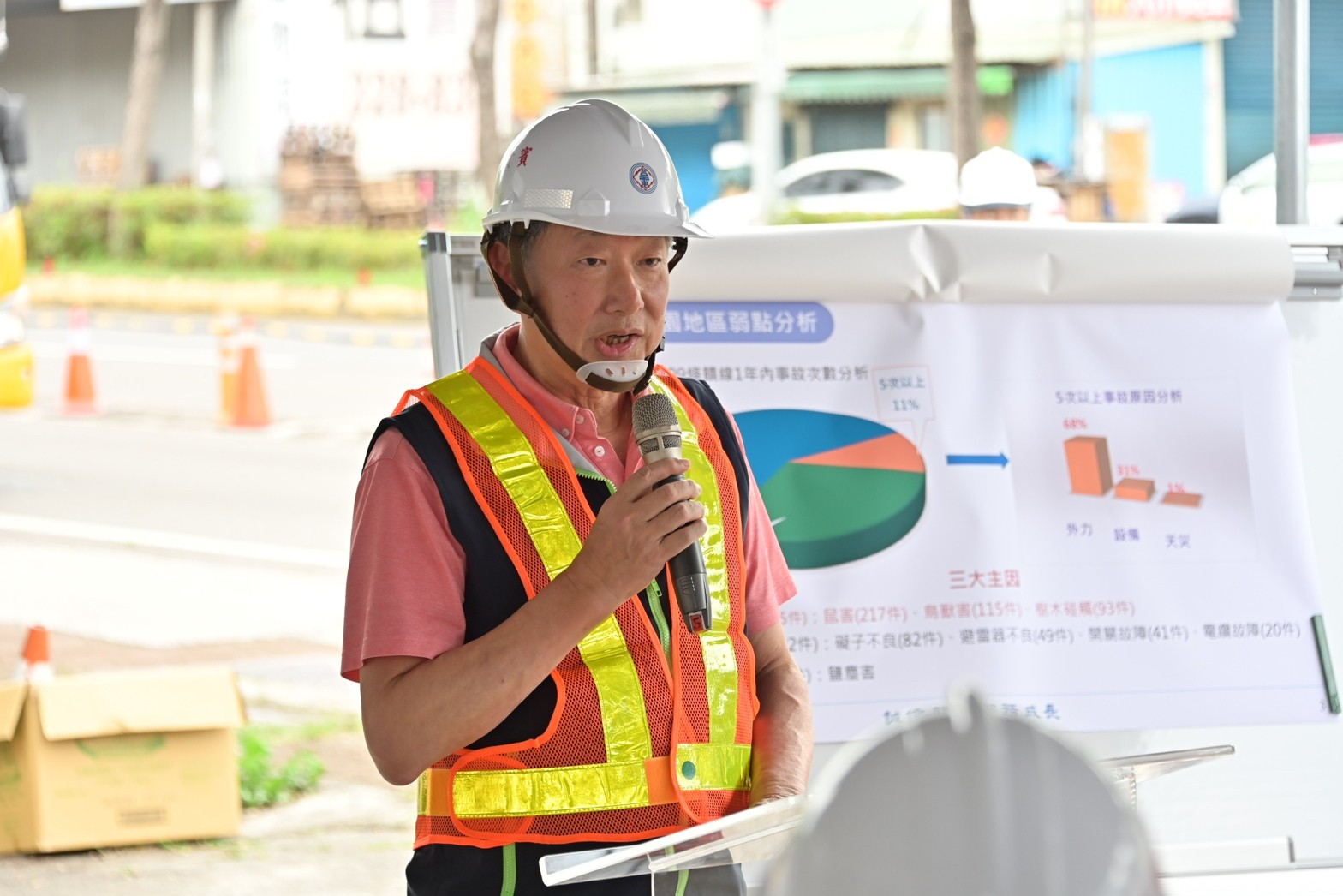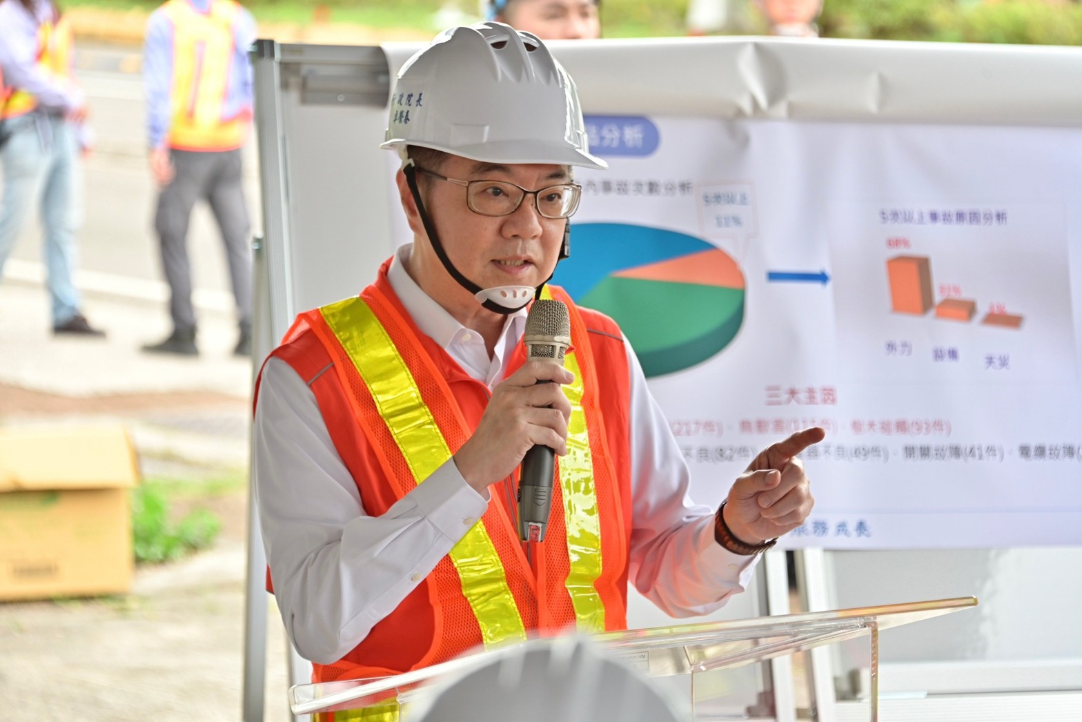 卓院長到場後,首先向在電桿上更換電力設備的台電同仁加油打氣,隨後聽取王耀庭總經理說明「台電公司桃園區處穩定供電作業」簡報。王總經理於簡報時表示,桃園地區停電事故主因在於鼠害、鳥獸害與樹木碰觸外力、設備老舊及天災等因素造成,因此台電此次將電線桿上裸露的導線更換成具有絕緣功能的導線,減少外力影響,並於人口較稠密的地區優先施作;同時,台電也啟動跨區處支援,進行配電饋線專案巡檢及維護改良工作,在多方努力下,停電事故已由4月每週12件,降至5月每週6件。王總經理指出,桃園地區因人口及用電戶數快速成長,因此亟需擴增配電饋線及變電所,不然電源有電但線路故障也無法送電,請桃園市民及地方政府體諒支持,讓電力建設能夠順利推動,以更加穩定民生用電。