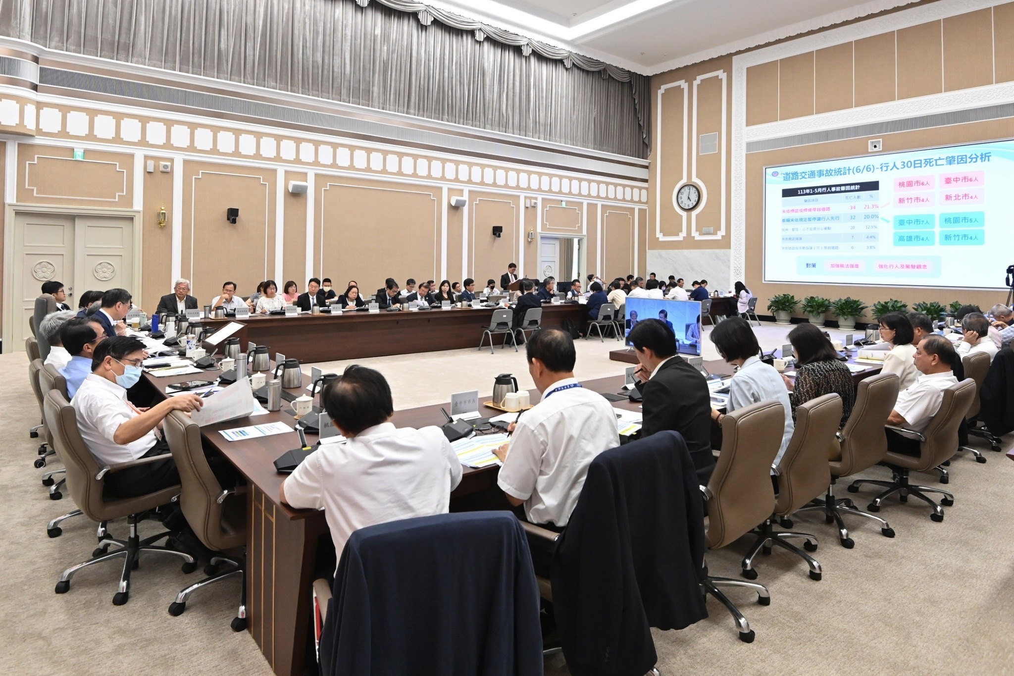 此外,卓院長表示,今日報告特別列出今年5、6月交通事故死亡人數連續增加的縣市,以及今年行人死亡人數與去年同期相比增加的縣市,請相關數據增加的縣市積極落實各項道安改善措施,研提具體改善計畫,以遏止行人死傷,降低事故發生。卓院長強調,提升道路交通安全需要中央、地方及全民共同投入,唯有跨部會及各級政府共同合作推動,持續不斷落實執行執法、工程及教育宣導等各項事故防制工作,才能有效降低事故發生。