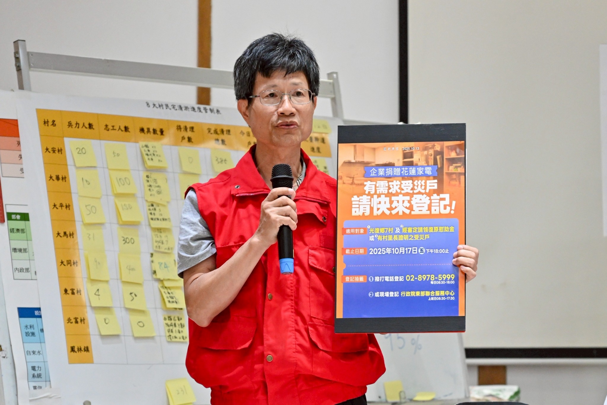 隨後,經濟部商業發展署陳秘順副署長表示,針對受災戶家電捐贈登記抽籤作業,包含經審定請領復原慰助金或有村里長證明之一般受災戶,請主動透過專線電話(02-8978-5999)登記或至行政院東部聯合服務中心填寫實體表單登記,納入後續抽籤名單;至於低收入戶及中低收入戶,經濟部已主動洽詢其需求並配合天候調整安排配送時間,不需登記抽籤。
