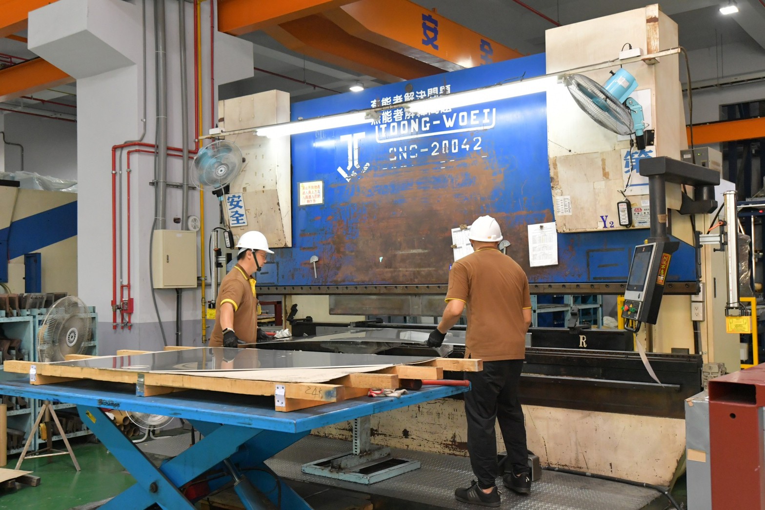 致詞結束後,卓院長在吳董事長的解說下,逐一參訪工廠「晶圓廠空中走行式無人搬運車軌道」、「海上風力發電機電乘載架」等產線,以及「自動折床產線與自動倉儲系統」,了解工廠自動化機具效能,最後一行人於辦公大樓門口合影留念。