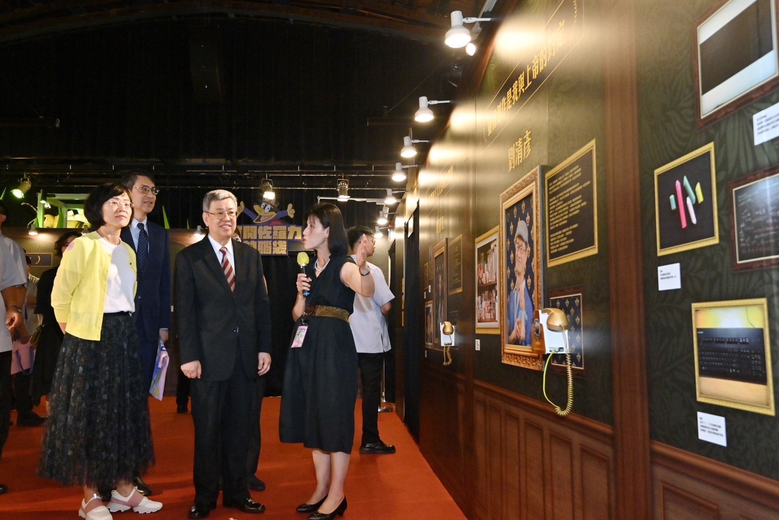 陳院長到場後,首先欣賞「MIT米特薩克斯風重奏團」開幕演奏表演,並於致詞後,手持人氣生物科普漫畫主角「動物警探達克比」玩偶與貴賓們於座位上進行大合影,為活動正式揭開序幕;隨後,在「親子天下」林欣靜總編輯導覽下,參觀「打開達克比的縮小糖」、「打開圖書館員的秘密」及「打開樂樂的遊戲基地」等展區,聽取策展理念、推展兒童台語學習及經典童書作繪者創作歷程等介紹。