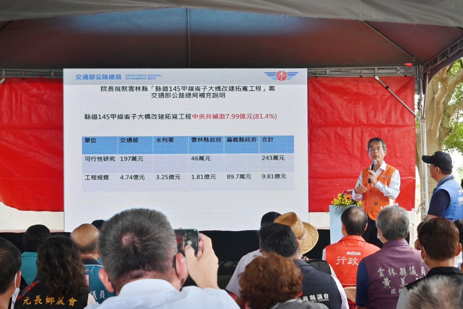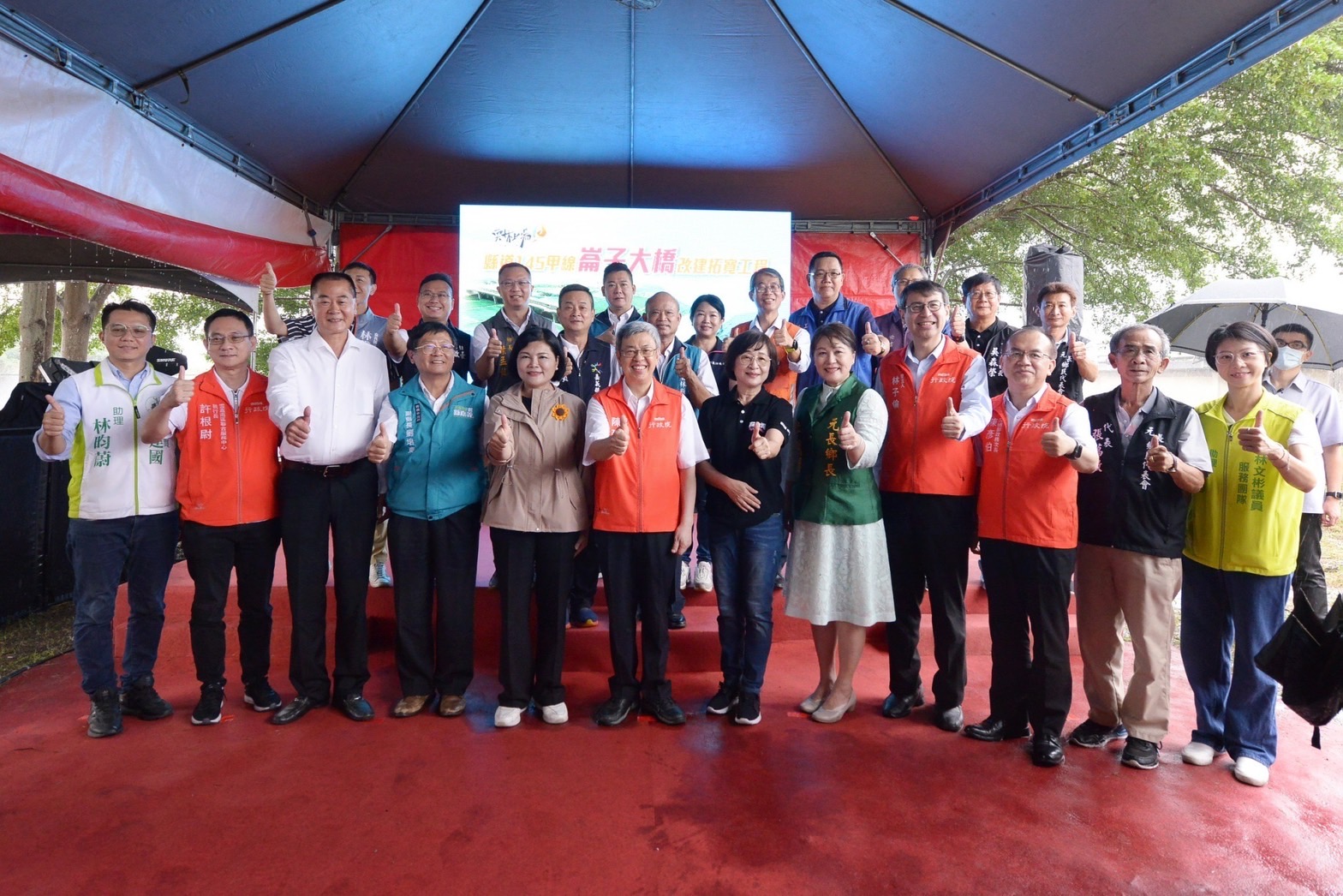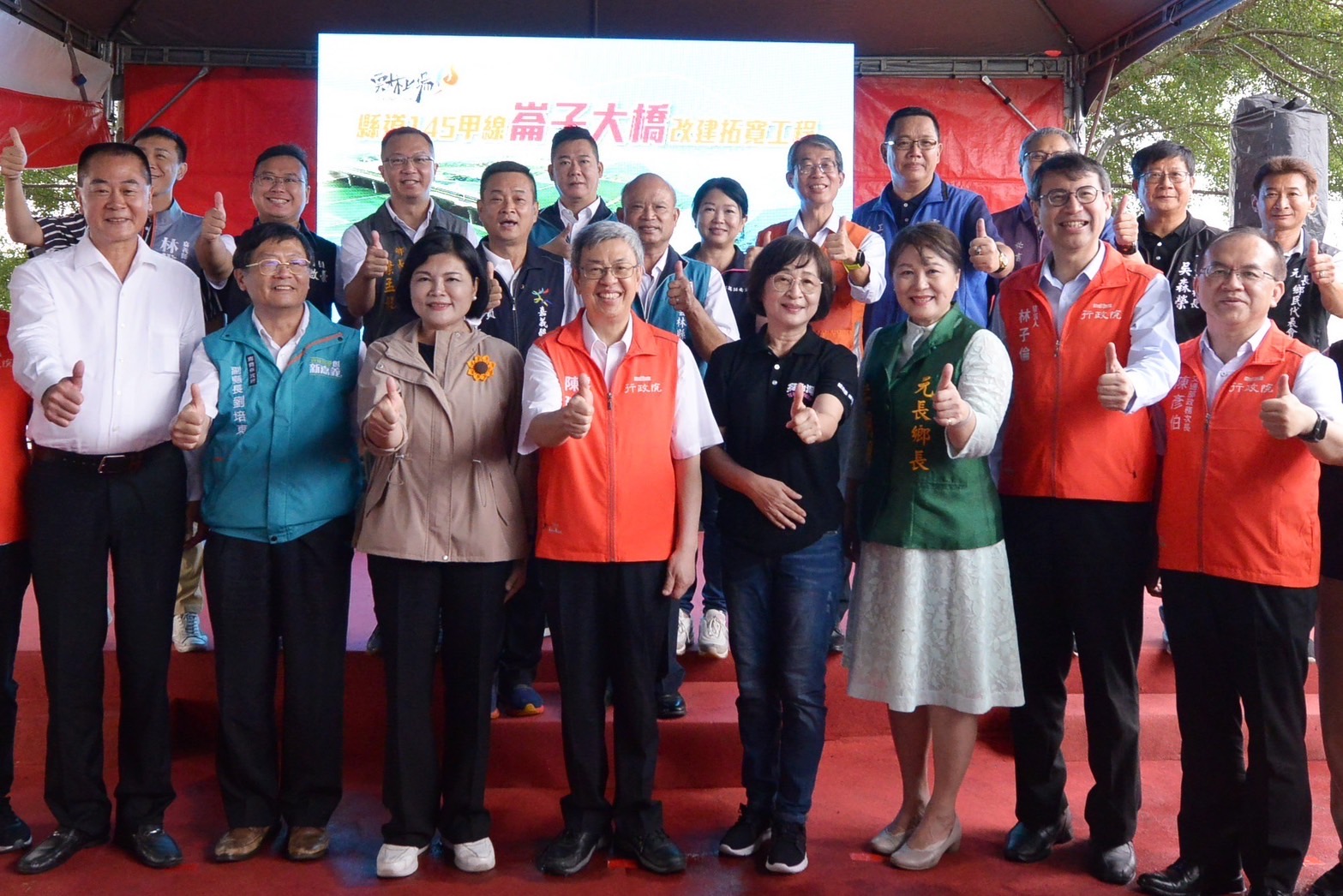 此行,陳院長先觀賞該工程介紹影片,並聽取雲林縣工務處汪令堯處長進行工程簡報,以及交通部公路總局陳文瑞局長補充說明,瞭解工程特色及改建後效益。隨後,陳院長與行政院林子倫發言人、交通部陳彥伯次長、蘇治芬立委、林文瑞立委、雲林縣張麗善縣長、嘉義縣劉培東副縣長等貴賓合影留念。
