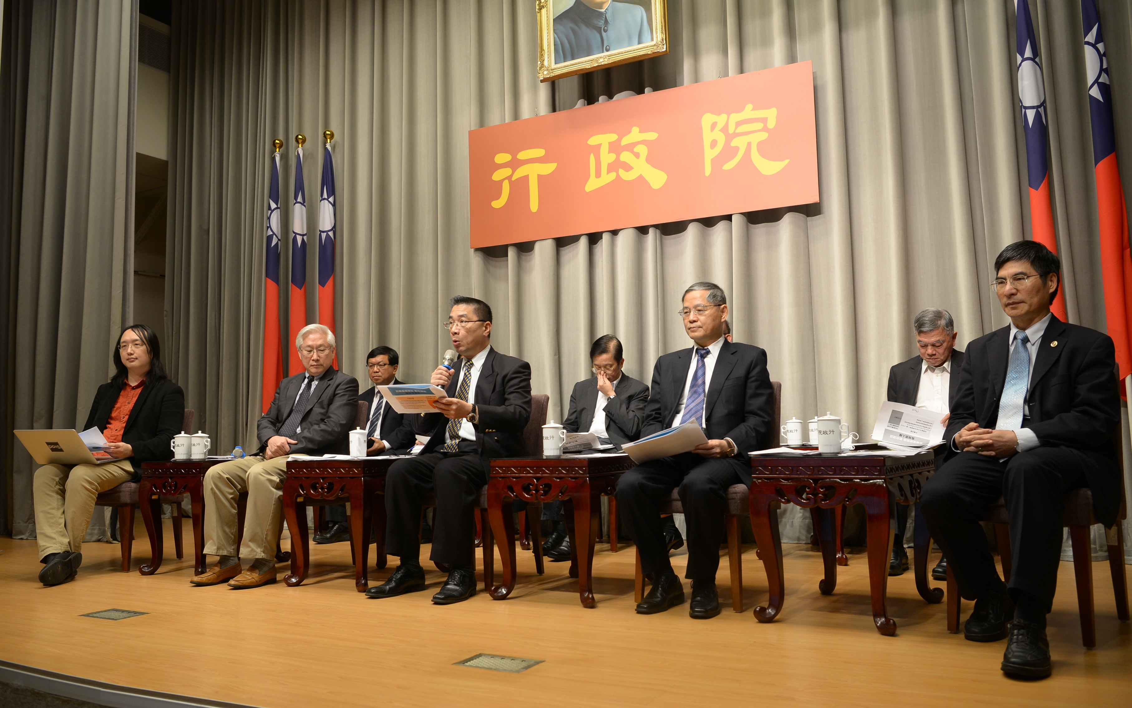 今天記者會由行政院發言人徐國勇主持,出席的首長有政務委員吳政忠、唐鳳、國發會主委陳添枝、科技部長陳良基、內政部次長邱昌嶽、經濟部次長沈榮津、教育部次長林騰蛟、文化部次長李連權及通傳會副主委翁柏宗。