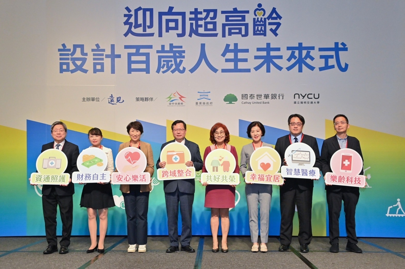 隨後,鄭副院長與臺東縣饒慶鈴縣長、臺中市王育敏副市長、遠見雜誌楊瑪利社長、臺北市立關渡醫院陳亮恭院長、國泰世華銀行信託部陳美娟協理、工研院生醫與醫材研究所莊曜宇所長、華碩機器人暨智慧應用事業部王恒聰總經理等人,手持手板標語合影留念,為論壇揭開序幕。