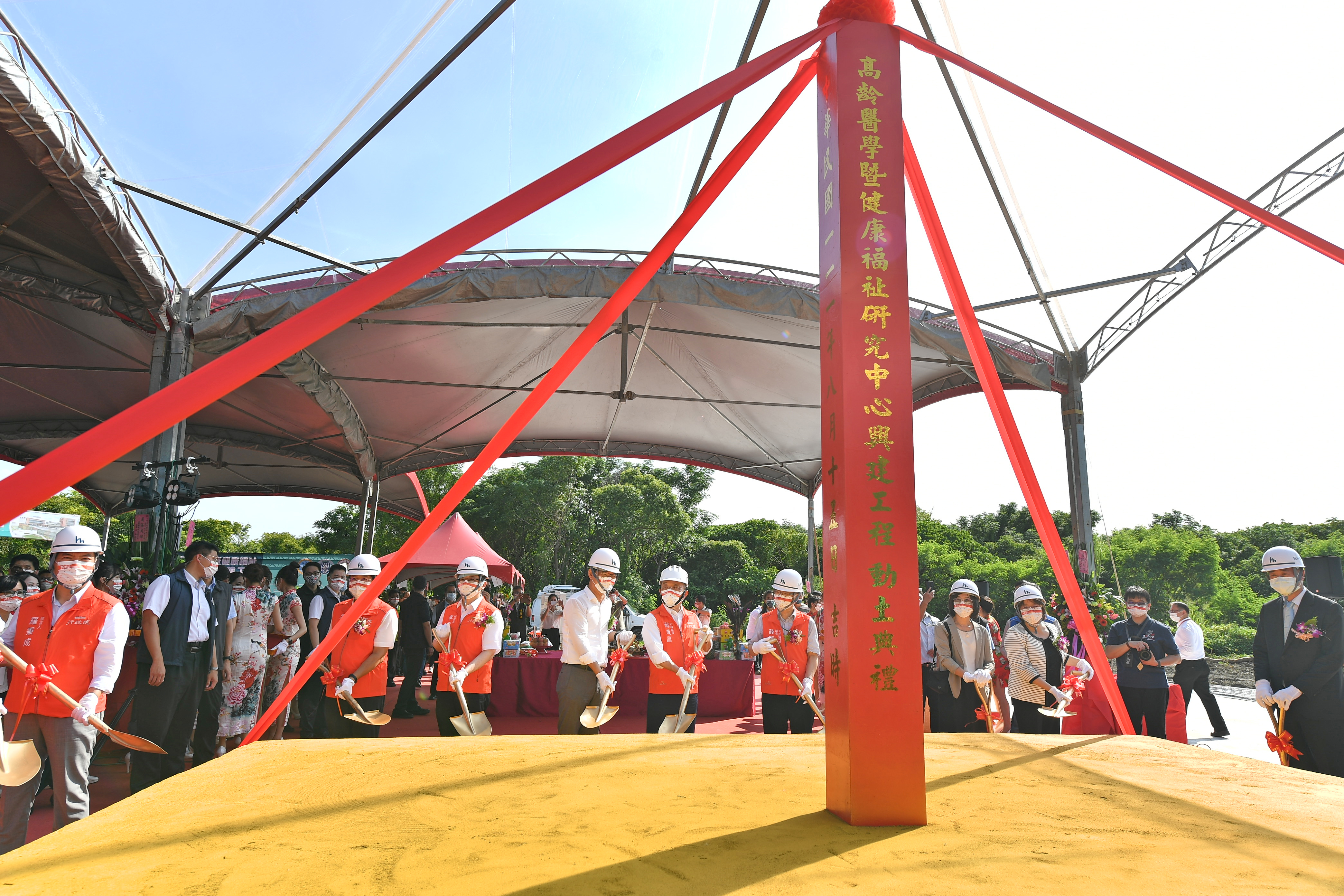 今日高齡醫學暨健康福祉研究中心興建工程動土典禮在祥獅獻瑞及鑼鼓聲中熱鬧開場,蘇院長致詞結束後也主持開工祝禱儀式,虔誠獻花、獻菓、獻酒、獻饌、獻財帛,祈求工程順利,並提起金鏟,起鍬三鏟,完成動土儀式。隨後,蘇院長蒞臨臺大醫院雲林分院虎尾醫院時,先與現場嘉賓合影留念,並聽取臺大醫院雲林分院馬惠明院長簡報該分院虎尾醫院醫療大樓、綜合大樓及醫護宿舍新建工程進度報告,並至頂樓鳥瞰工程預定地。