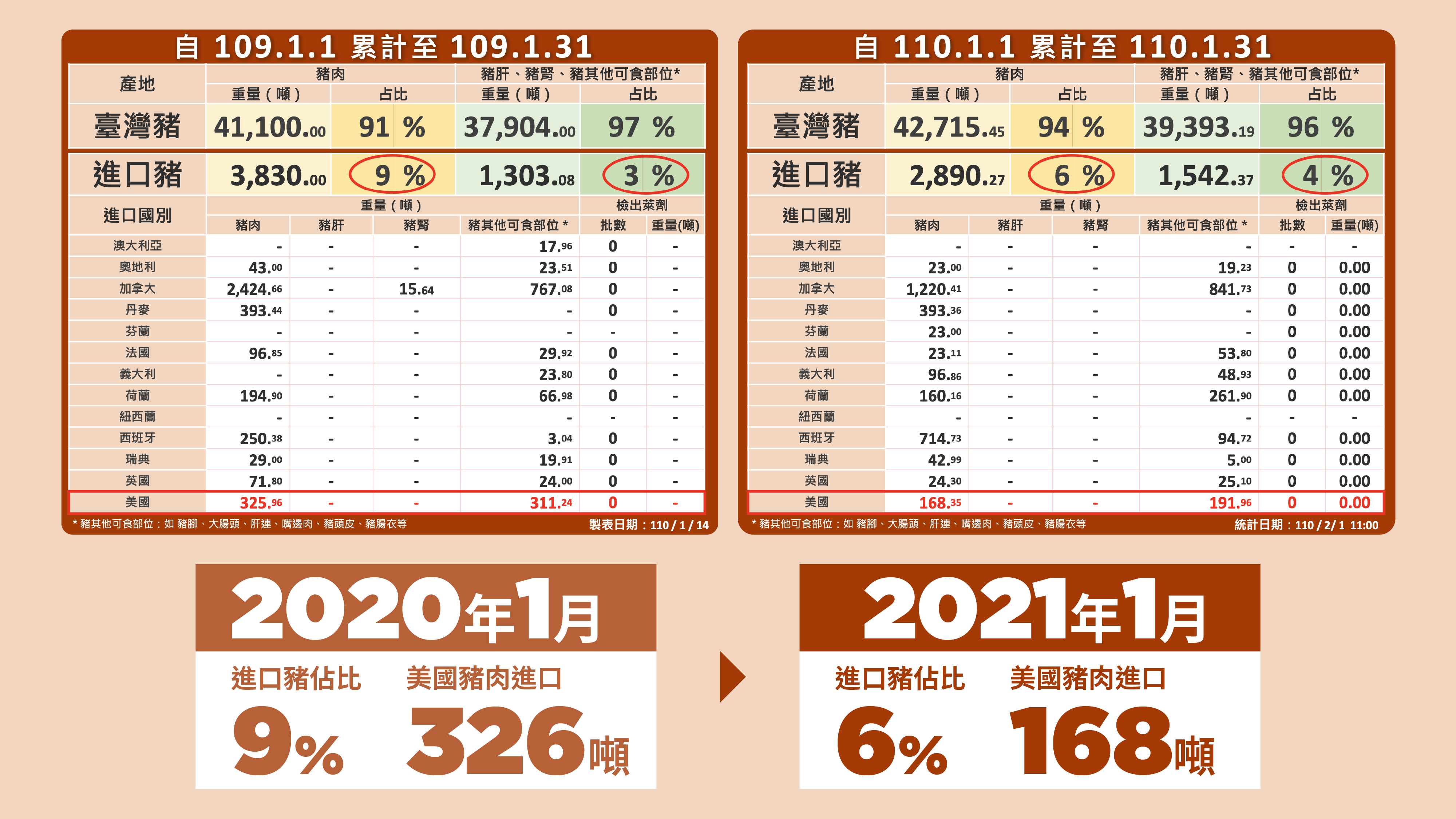 蘇院長表示,去(109)年8月28日,蔡英文總統基於國家經濟利益與臺灣總體戰略目標考量,向國人同胞報告,擴大美豬、美牛進口政策。行政院除持續向各界溝通,同時也要求各相關部會做足各項準備工作。自今(110)年1月開放美豬進口以來,每個上班日上午11時,都會在相關部會網站發布「豬肉儀表板」,公布前一日及自1月以來累計的臺灣豬與進口豬重量及占比、進口國來源地、查驗萊劑結果等資訊,讓社會各界可清楚查詢,一目瞭然。