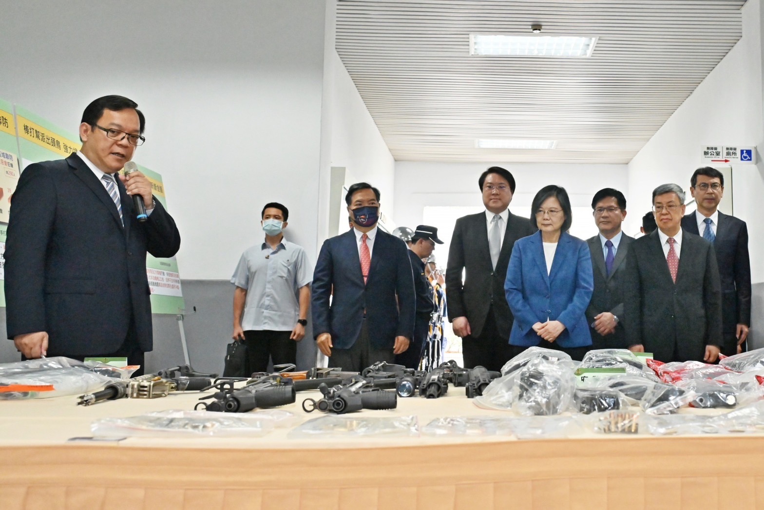 此行,首先由警政署刑事局科長鄺慶泰及保安組科長林志駿向在場貴賓解說打擊黑幫、肅槍及溯源管理成果,並展示查獲之各式改造槍枝。隨後,陳院長親自頒發資深績優警察獎章予10位得獎者,並與得獎者及其親友合影;最後,院長偕同貴賓與全體模範警察合影,並親切與家屬孩童互動寒暄,氣氛溫馨和樂。