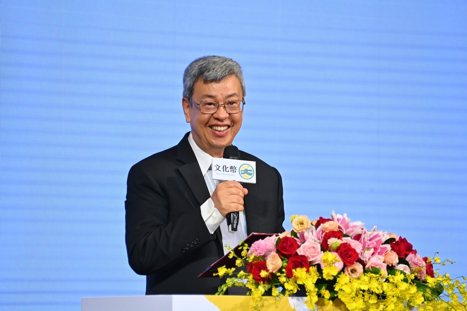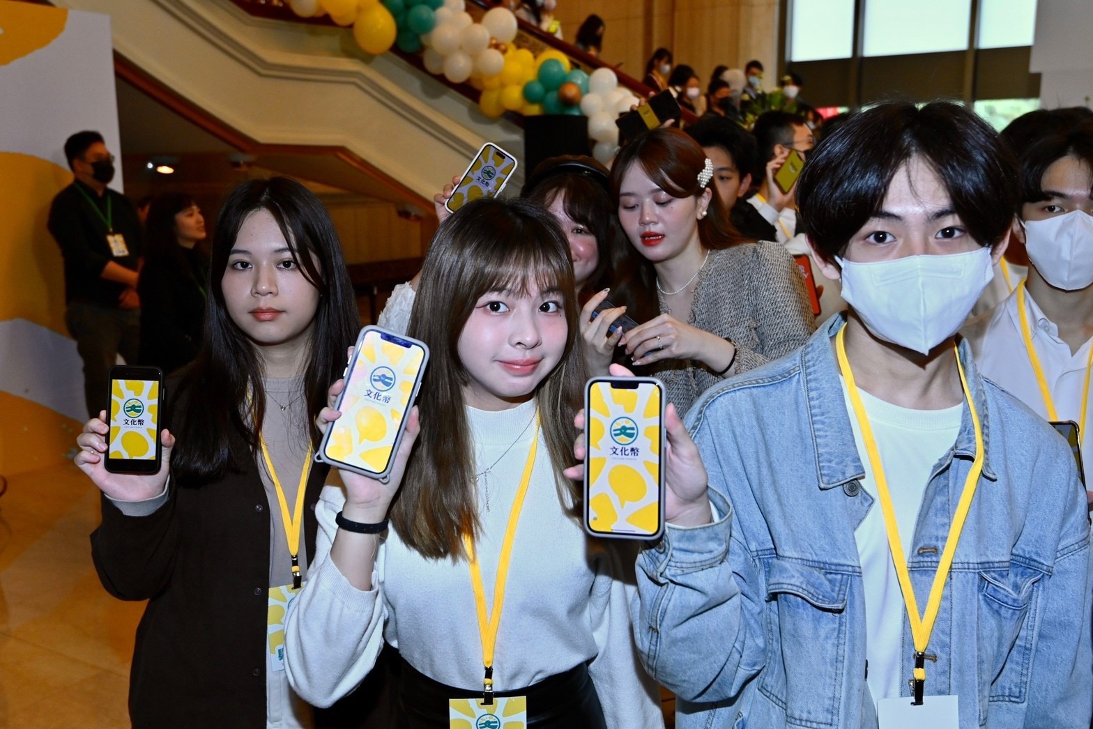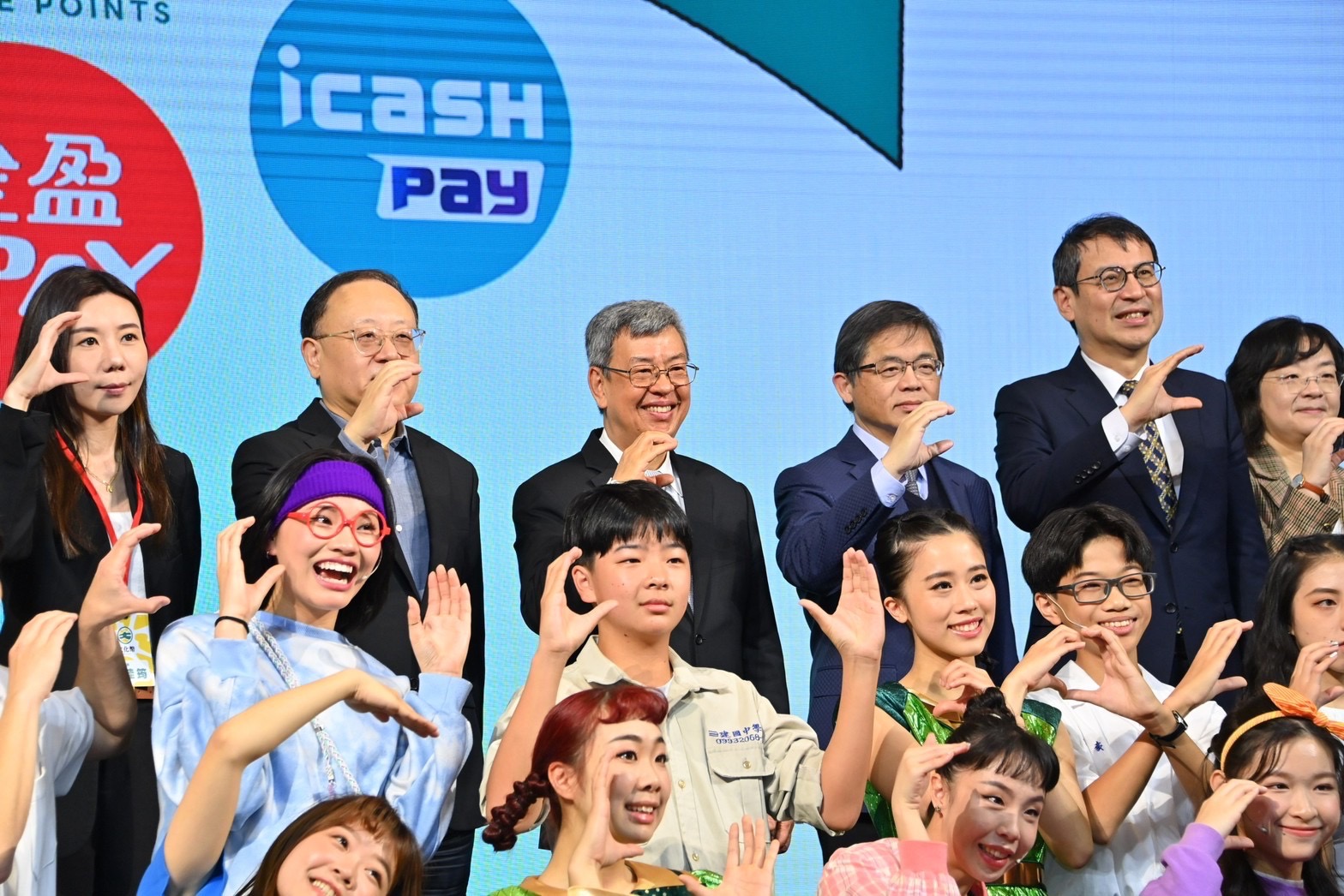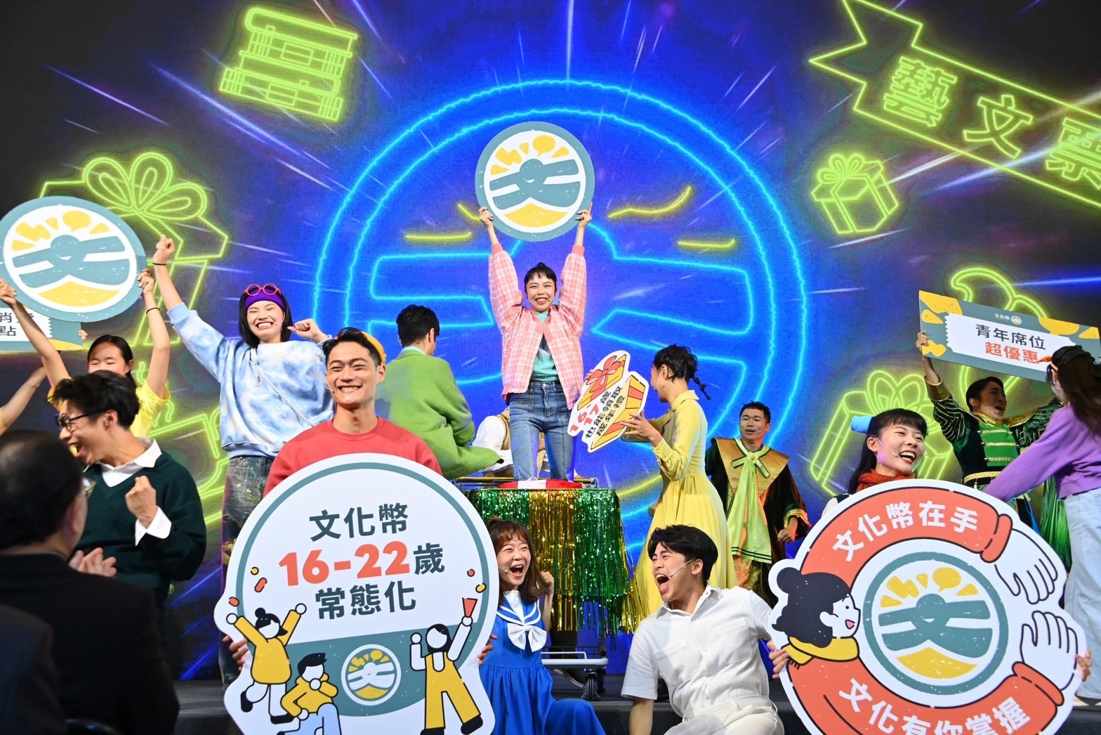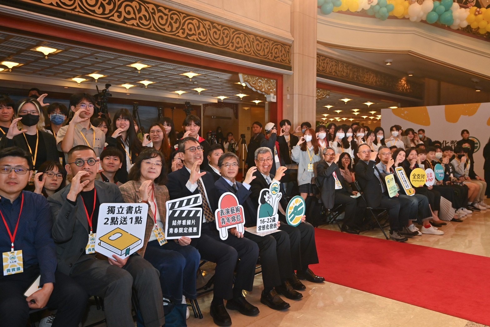 陳院長到場後,首先於座位區和現場貴賓、青年學生合影,並一同比出代表文化幣的「C」手勢。隨後,陳院長觀賞「體驗文化幣的美好」情境劇表演、文化幣宣導微電影《文化幣,與你一起完成年輕時的夢想》,並聽取主持人楊千霈介紹文化幣使用方式。致詞結束後,陳院長與行政院李孟諺秘書長、林子倫發言人、文化部史哲部長、文化內容策進院蔡嘉駿董事長,以及文化幣電子支付業者全支付陳佳筠營運長、全盈+PAY唐蜀茜執行副總經理暨營運長、icash Pay鄭沛倫副總經理等貴賓及表演人員於舞臺上,與現場約150名可使用文化幣的學生大合影留念。