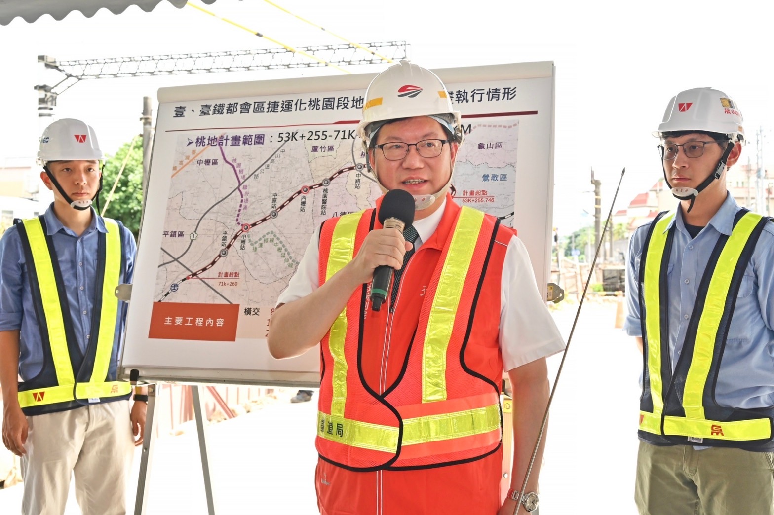 鄭副院長特別感謝鐵道局等施工團隊,利用夜間列車收班時段進場施工,並在狹隘的空間內,施作高難度的連續壁與移軌相關工程。他要求鐵道局團隊,務必以最嚴謹的態度辦理鐵路地下化工程,期間要確保工程品質、人員安全及周遭交通順暢,期勉桃園鐵路地下化能如期如質完工通車。