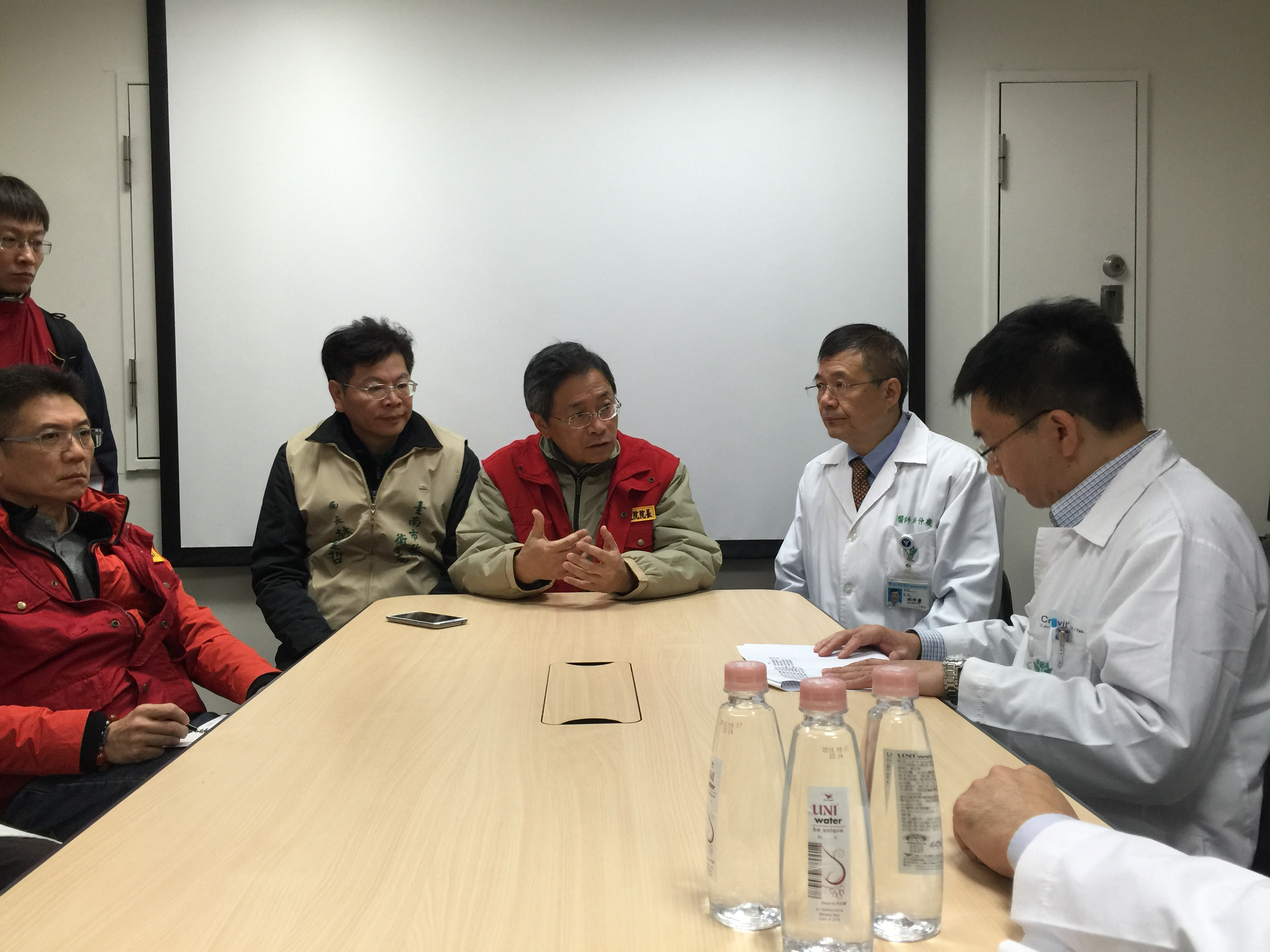 張院長在前往臺南市永大路倒塌大樓勘災後,隨後轉往附近的收容中心及醫院慰問傷者及家屬,看到在現場及醫院焦急等待的傷患及家屬,張院長表示心裡非常難過,並承諾政府會加速救災進度,一定會盡全力儘速將受困民眾救出,請傷患及家屬保重身體。張院長也慰問參與現場救災的人員,並提醒消防及國軍弟兄,注意自身安全。