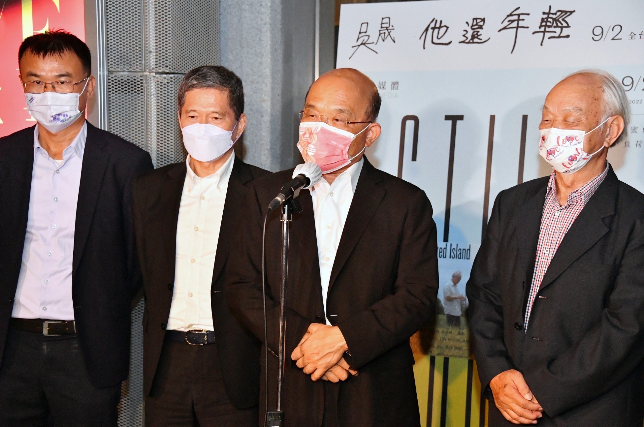 行政院長蘇貞昌今(1)日晚間前往光點華山電影館出席《他還年輕》特映會時表示,他與吳晟老師已認識數十年,深知吳老師對臺灣這塊土地的熱愛與感情,今天特別邀請大家一同前來觀賞這部以吳老師為傳記主角的文學紀錄片,希望讓大家能從中了解吳老師最真實的一面。院長也感謝「目宿媒體」願意長期投入拍攝「他們在島嶼寫作」系列紀錄片,以影像記錄當代華文文學作家,至盼相關部會未來積極結合民間資源和力量,持續推動相關工作。