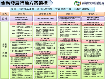 金管會表示,此行動方案針對「銀行業」、「證券期貨業」、「保險業」及「金融科技」4大面向設定目標。「銀行業」為擴大金融機構規模,打造國際化理財平台;「證券期貨業」預計2年內股市新增百檔上市櫃;「保險業」為3年內保障型及高齡化商品(不含投資型)占比超過60%、5年內微型保險累積承保人數超過100萬人,以及3年內保險業新增國內5+2產業投資金額超過1,500億;「金融科技」是3年內每年受理10件金融創新實驗申請案。