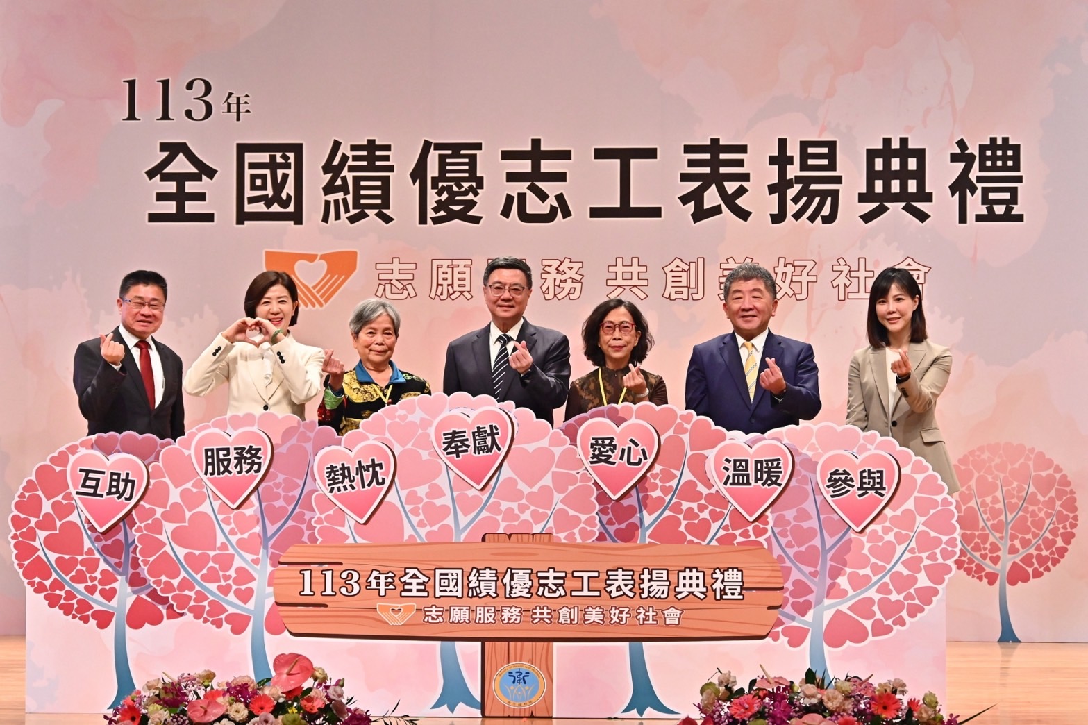 致詞結束後,卓院長偕同陳時中政務委員、李慧芝發言人、衛生福利部呂建德次長、王育敏立委、財團法人創世社會福利基金會詹廖玲婕志工代表、國軍退除役官兵輔導委員會雲林縣榮民服務處楊美玲志工代表分別手持「奉獻、溫暖、愛心、熱忱、互助、服務、參與」等標語的心形手拿板,貼上啟動儀式板,完成啟動儀式。隨後,卓院長親自頒發志願服務績優金牌獎予30位得獎志工,並逐一與得獎志工握手表達感謝。