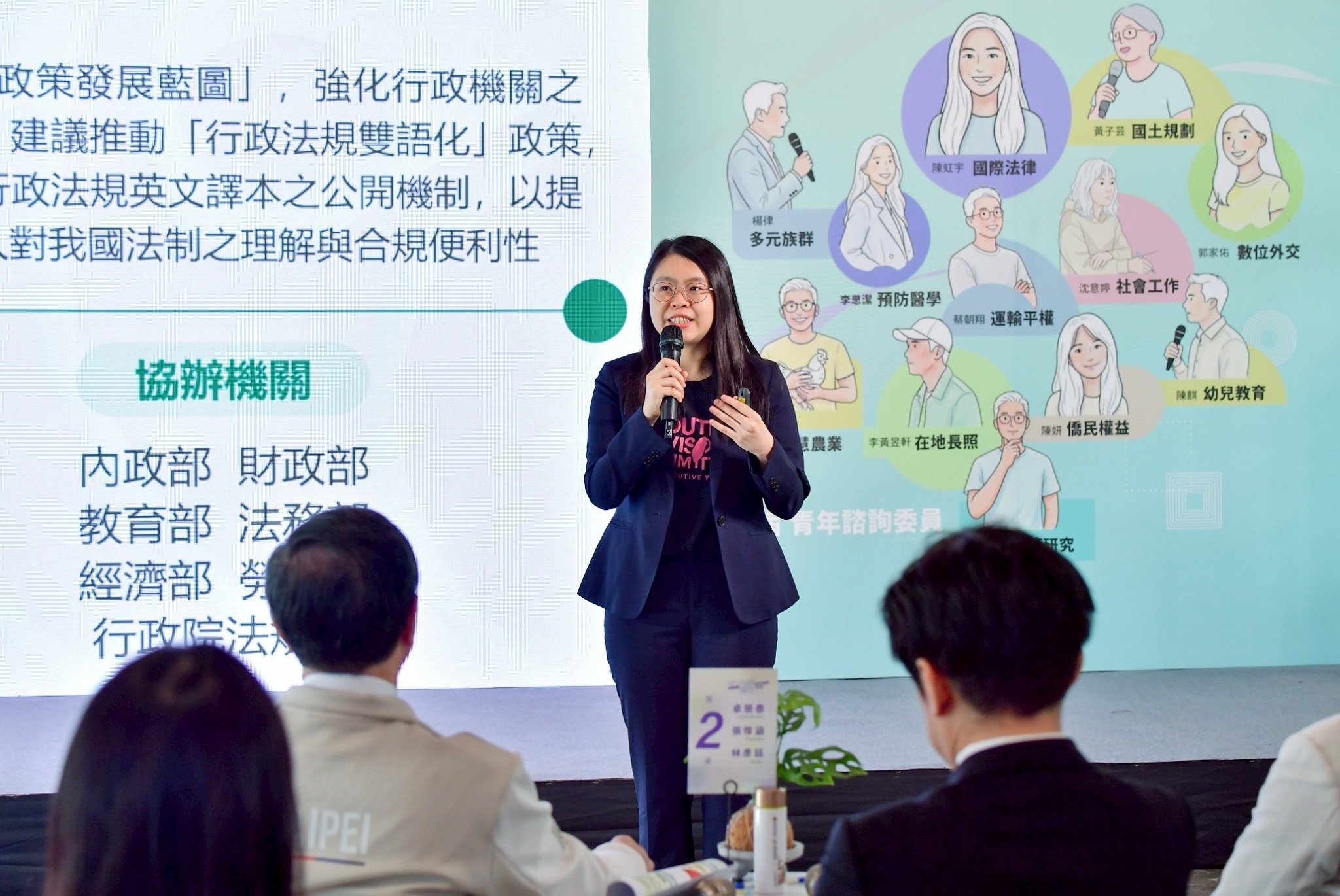 針對青年委員提出「為配合我國『2030雙語國家政策發展藍圖』,強化行政機關之語言友善性與國際接軌能力,建議推動『行政法規雙語化』政策」一案,卓院長表示,請國家發展委員會持續參酌各種國外英譯模式,積極徵詢外國商會及外部專家學者意見,並評估運用AI工具,輔助部會法規英譯之可行性,以提升英譯效率與品質。