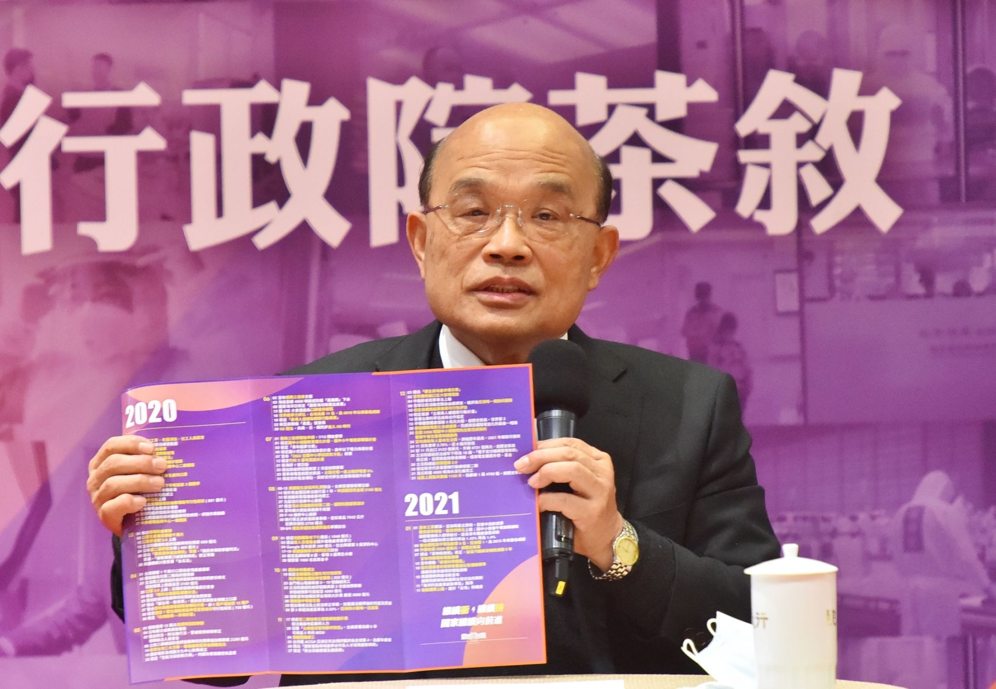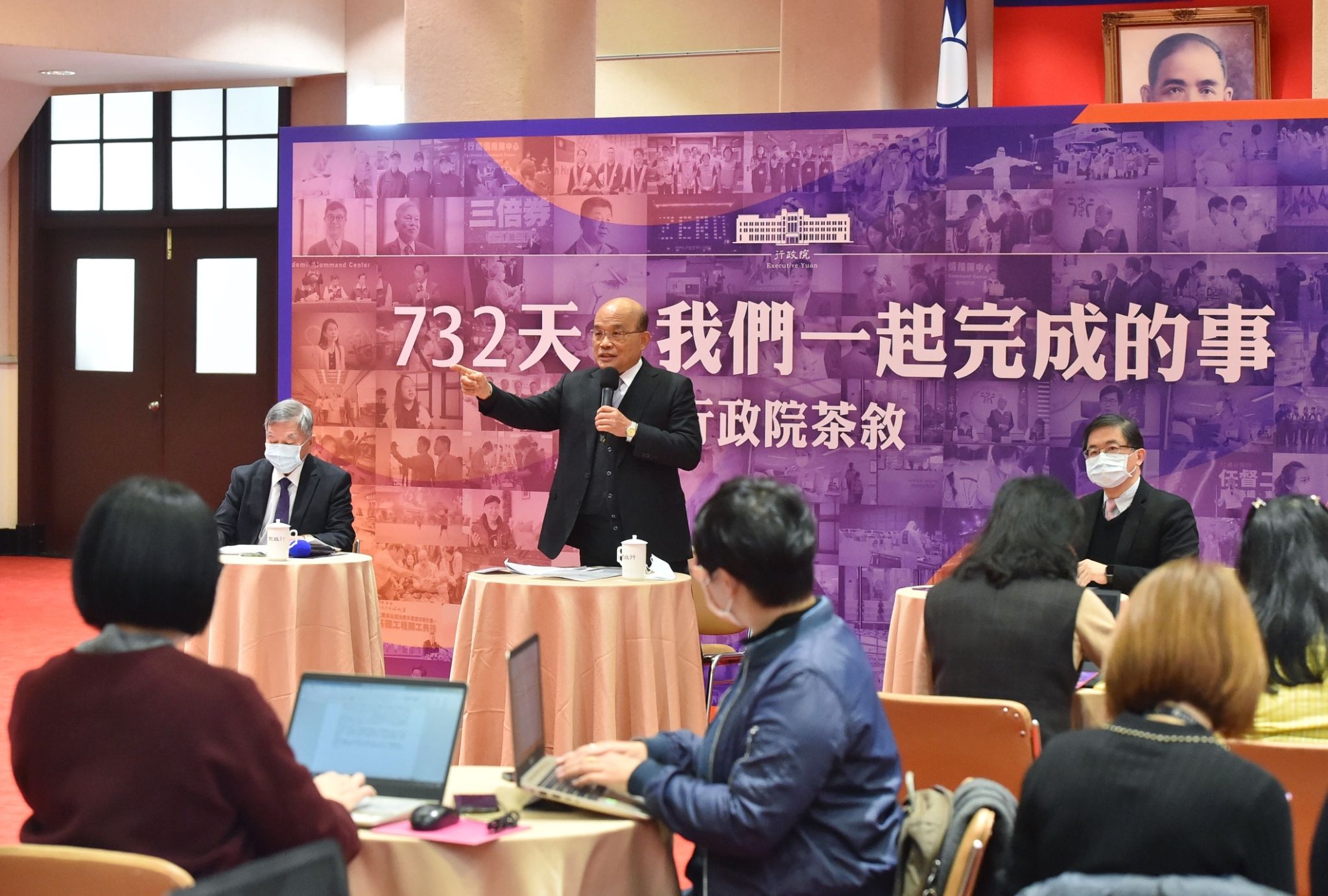 蘇院長指出,總統昨(13)日與他深談,她很高興這2年不但行政團隊做出這樣相當的成績,且政府財政還能連續三年歲入歲出能有賸餘;對於未來的發展,也更有信心,也有許多事情還要繼續來推動。蘇院長進一步指出,總統曾經公開說,他是護國的院長,但他更希望國人同胞給予過去732天來這麼努力的行政團隊鼓勵,稱呼他們是「護國團隊」,就是對所有的行政團隊、公務人員最大的溫暖,將來也一定會更努力。