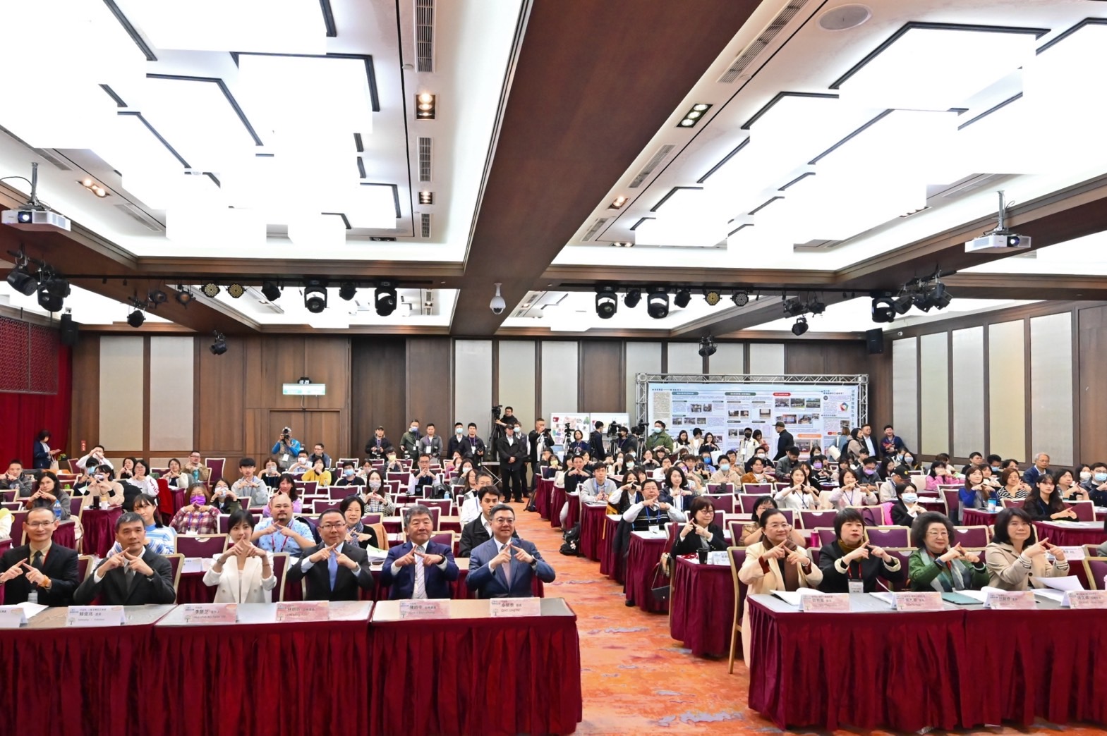 此行,卓院長到場後,與行政院陳時中政務委員、林明昕政務委員、李慧芝發言人、監察院國家人權委員會田秋堇委員、葉大華委員、監察院范巽綠委員,以及行政院人權任務編組委員等貴賓一同比出「人」字手勢,象徵大家對於人權價值的堅持與支持,並於座位上合影留念。