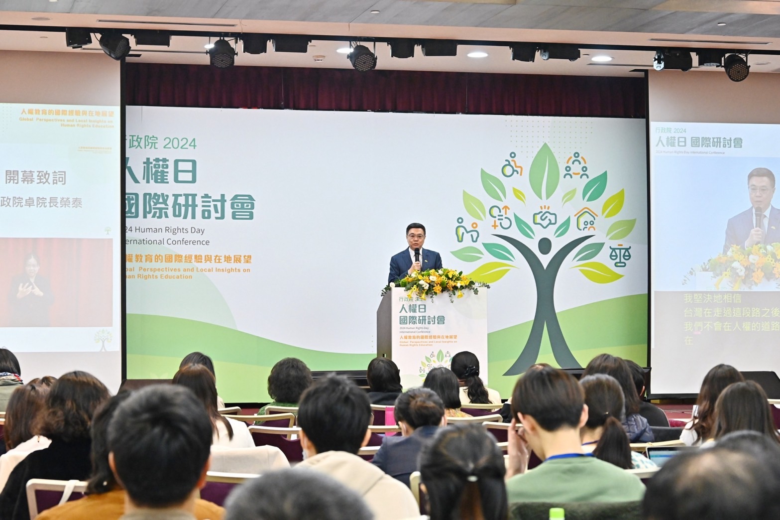 卓院長指出,人權是普世價值,也是臺灣與世界理念相近國家及夥伴們相互連結最有效的一股力量,因此政府格外珍惜。而這份對人權的珍惜來自臺灣在歷史上所走過的那一段路,許多民主前輩都付出犧牲,也使我們這一代逐漸體認到自身責任愈發重要。對此,行政院自2022年成立人權及轉型正義處以來,每年都會在12月10日國際人權日前夕,舉辦學術研討會,而今(2024)年的主題為「人權教育的國際經驗與在地展望」,非常感謝各位報告人、主持人、與談人、民間團體與代表提供寶貴意見,共同擘劃未來如何更鞏固人權工作及民主發展。