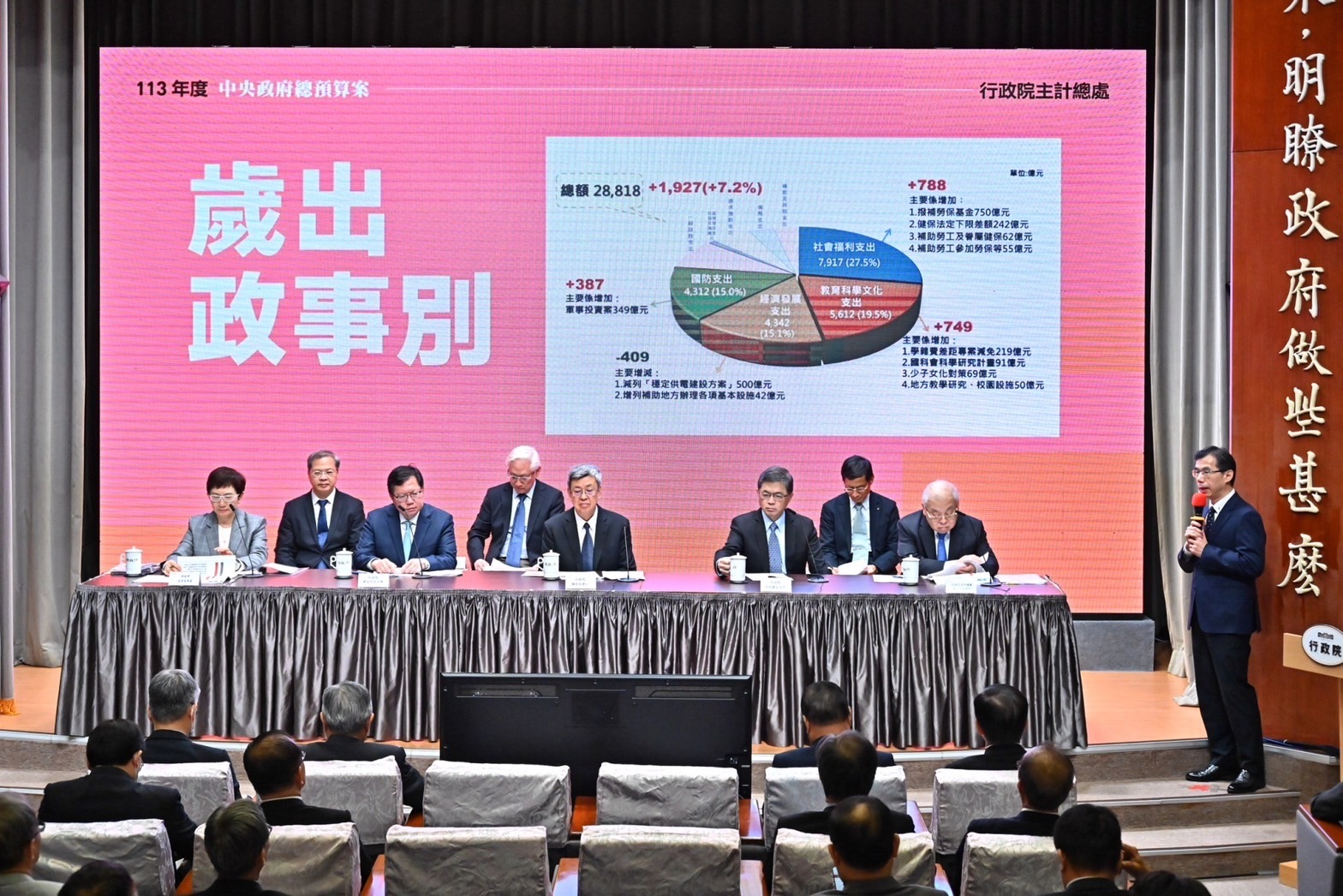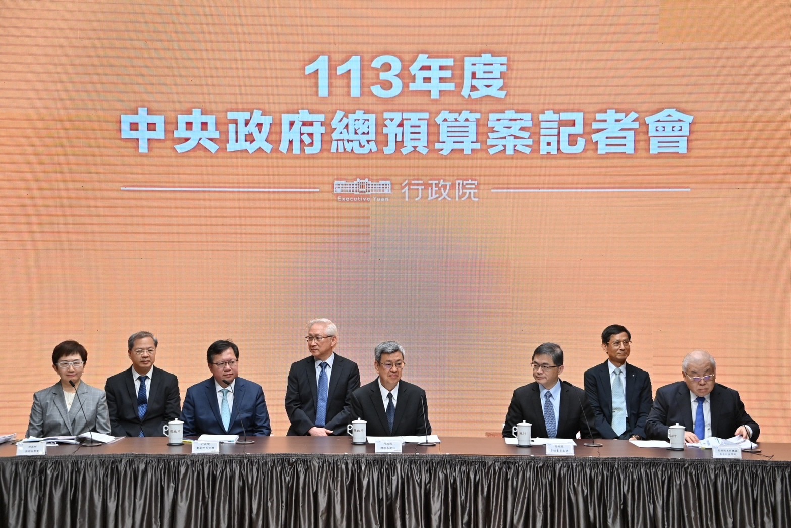 「113年度中央政府總預算案暨附屬單位預算及綜計表」已於今(24)日在行政院會通過,行政院長陳建仁於院會後偕同鄭文燦副院長、李孟諺秘書長、林萬億政委、吳政忠政委兼國科會主委、龔明鑫政委兼國發會主委、財政部莊翠雲部長、朱澤民主計長及各相關部會首長及副首長共同召開記者會,向國人報告明(113)年度中央政府總預算案籌編情形,此次共計編列歲入2兆7,092億元及歲出2兆8,818億元。院長承諾行政團隊將依據「強韌經濟、永續發展」、「溫暖家園、貼心照顧」、「守護臺灣、立足世界」等三大施政主軸,全力落實蔡英文總統交付的任務,努力打造溫暖而堅韌的臺灣。