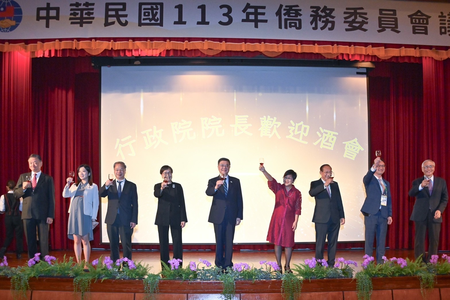 致詞結束後,卓院長與行政院龔明鑫秘書長、謝子涵代理發言人、僑委會徐佳青委員長、阮昭雄副委員長、呂元榮副委員長、張良民主任秘書、蘇春槐僑務委員、圓山飯店葉菊蘭董事長等人共同舉杯,祝福大家身體健康、萬事如意;卓院長也與僑務委員等貴賓互動寒暄、合影留念,場面熱絡。