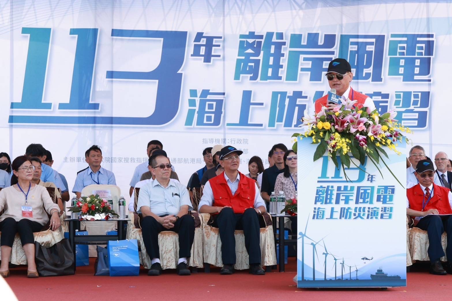 季政務委員致詞代表院長向所有參演人員的同心協力、合作無間、配合良好,表逹慰勉,肯定各單位對國家推動能源轉型及淨零轉型的努力,藉由此次演習可見各單位對於保障新興能源離岸風電的穩定發電,均責無旁貸且堅持不懈的滾動檢討離岸風場各式災害應處機制及量能,持續精進災害應變機制能力,確保當風場內有災害發生時,各機關(構)能即時啟動應變機制,將人民生命及財產的損失減少到最低。