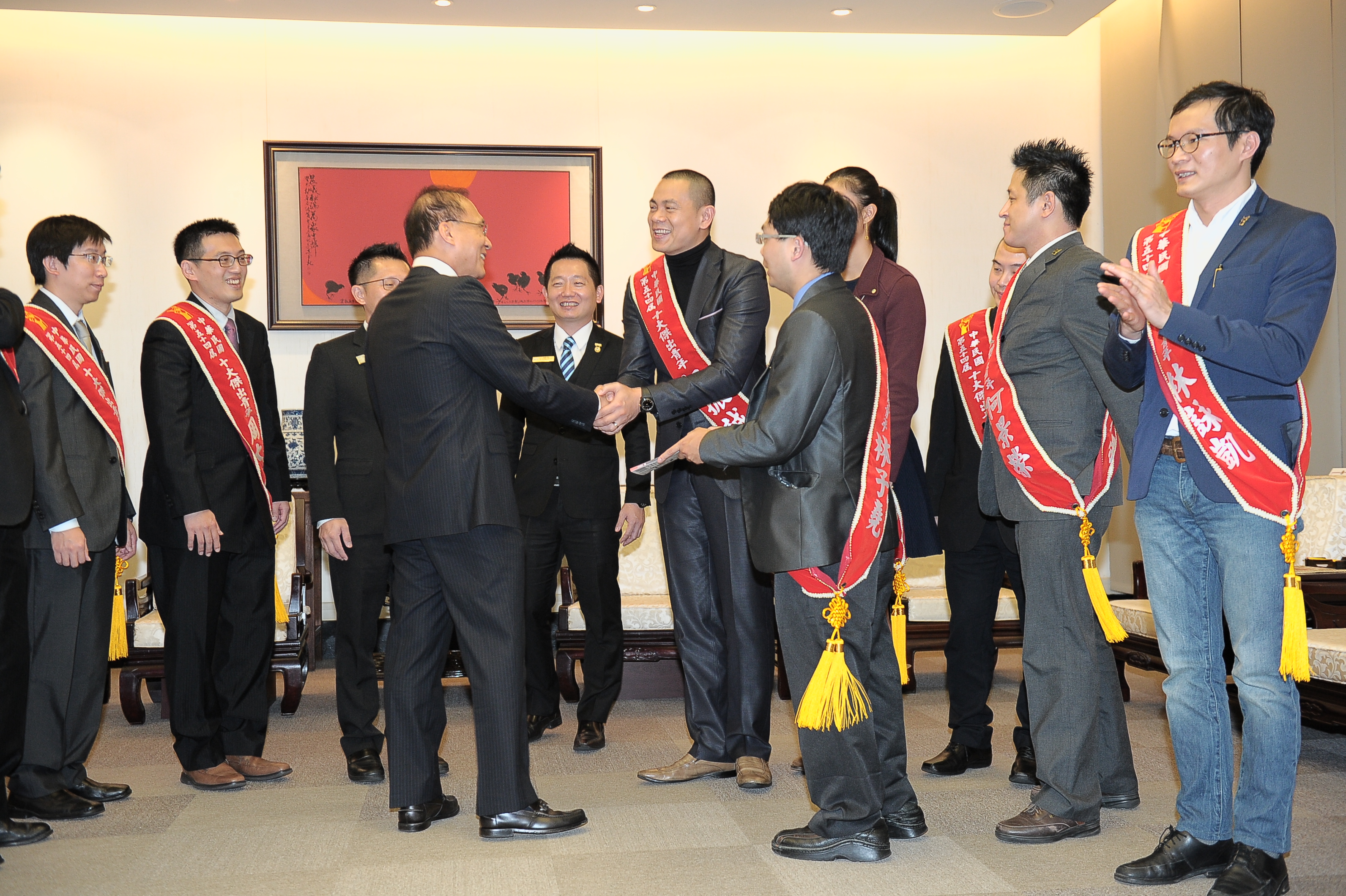 行政院長林全今(11)日在行政院接見國際青年商會中華民國總會「第54屆十大傑出青年當選人」一行,有感於當選青年們的努力歷程,林院長特別引用教書時常寫給畢業學生的感言,勉勵青年朋友要追求興趣、不怕挫折,努力發揮,最後一定能有所成就。人生最有樂趣的,莫過於興趣就是工作,工作也是興趣,繼而創造價值。