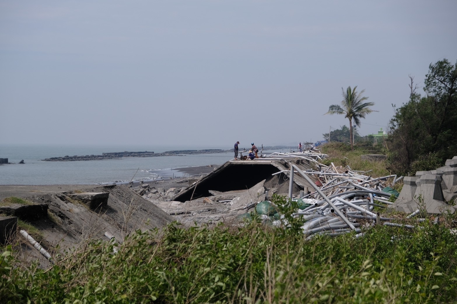 山陀兒颱風帶來強浪,造成屏東枋寮鄉大庄村下寮海堤破損,行政院長卓榮泰今(5)日前往當地視察,並聽取簡報瞭解當地海水供應站建置狀況及屏東縣全縣漁業損害情形。卓院長感謝所有防救災人員的辛勞,並請經濟部水利署第七河川分署提早進行下寮海堤復建工程發包作業,於明(114)年汛期前完工,同時也請農業部積極採用更多方式處理農損救助,照顧農民權益。