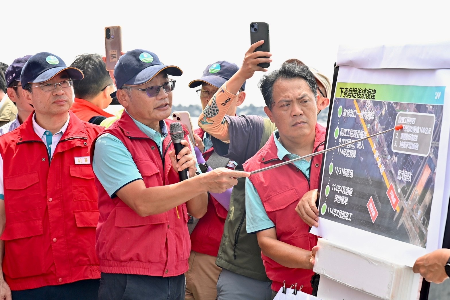 卓院長致詞時首先向大家說聲:「辛苦了!」,一整週大家都生活在風雨交加、心情不安的恐懼之中,他人雖在臺北,但隨時掌握各地災情狀況,經濟部郭智輝部長在第一時間便向他通報屏東下寮海堤破損情形,他也要感謝第七河川分署及時搶修破堤缺口。卓院長說,第七河川分署目前預估今年底前可完成下寮海堤復建工程發包、114年8月前可完成整體工程,請該分署在評估海象狀況許可下,提早進行工程發包作業,並於明年汛期來臨前完工,避免再次造成傷害;至於今年工程經費如有不足,可採移緩濟急方式處理。此外,針對屏東、臺東等地漁港流入漂流木部分,也請相關單位迅速打撈,維持漁港進出航道暢通,確保漁船航行安全。