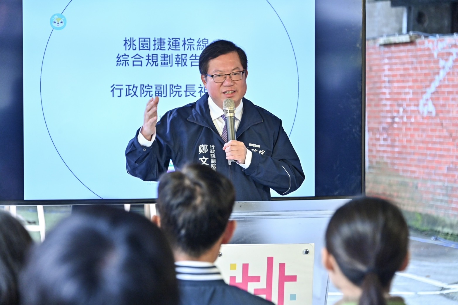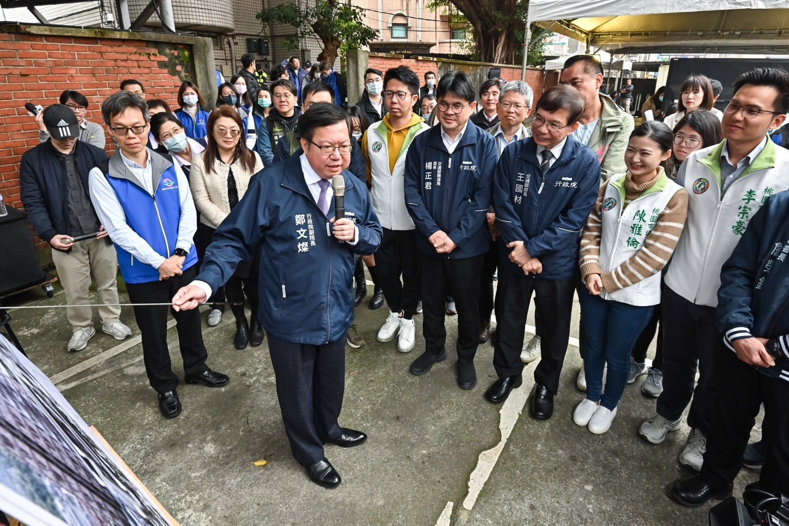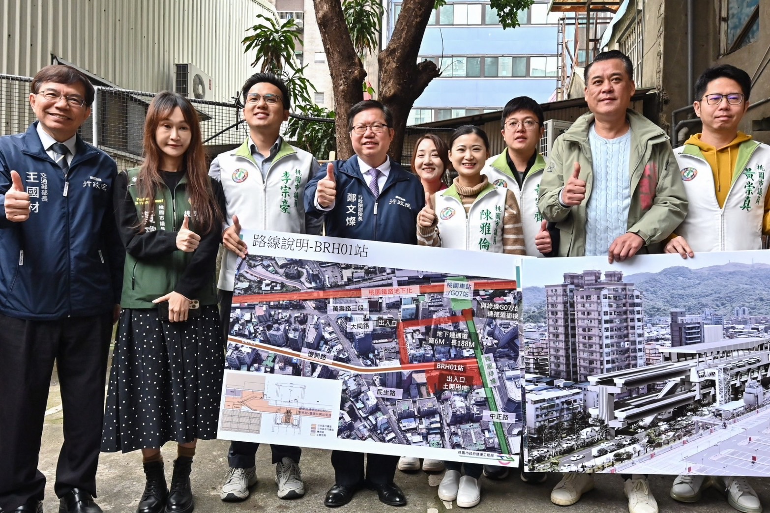致詞結束後,鄭副院長進行現地視察,並於聽取桃園市政府捷運工程局徐東隆科長說明相關路線規劃後表示,捷運棕線計畫可連結桃園市與中和新蘆線迴龍站,未來桃園及雙北市民將可透過鐵路、高鐵、捷運機場線、捷運三鶯線及捷運棕線等兩鐵三捷運方式往來通勤,打造桃園及雙北成為「一小時生活圈」。最後,副院長也偕同交通部王國材部長、鐵道局楊正君局長、路政及道安司蔡書彬副司長、桃園市政府詹榮鋒秘書長及捷運工程局廖振遠副局長大合影。