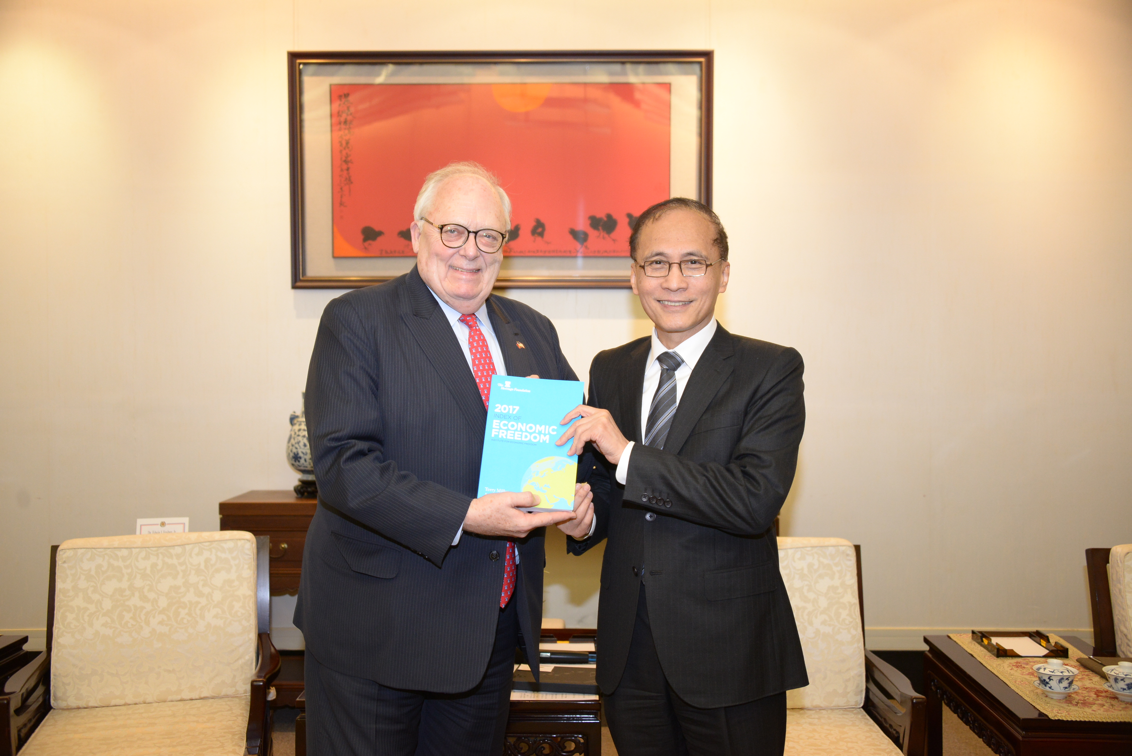 行政院長林全今(2)日於行政院接見華府智庫「傳統基金會」(The Heritage Foundation)創辦人佛訥博士(Dr. Edwin J. Feulner, Jr.),就台美簽署自由貿易協定、深化發展多元關係與產業合作等議題交換意見。