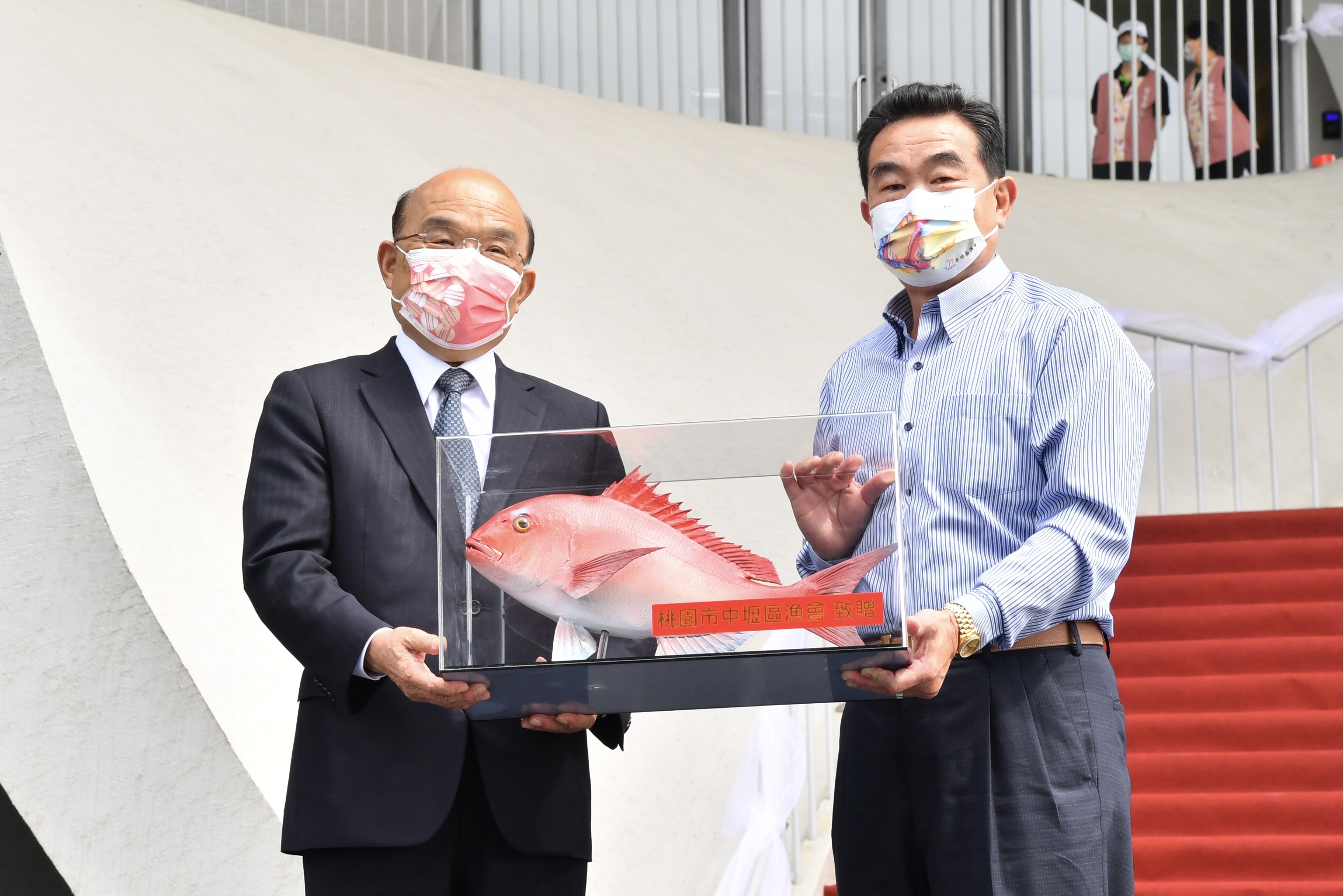 蘇院長抵達會場後,首先聆聽桃園海洋客家休閒農業發展協會成員吹奏海螺,並觀賞紅瓦民族舞蹈團開場表演,展現客家精神與文化;致詞結束後,院長除接受桃園市中壢區漁會理事長葉國傑代表當地漁民致贈的真鯛模型,亦與貴賓共同完成「永安海螺文化館」揭牌儀式,並合影留念,場面熱絡。