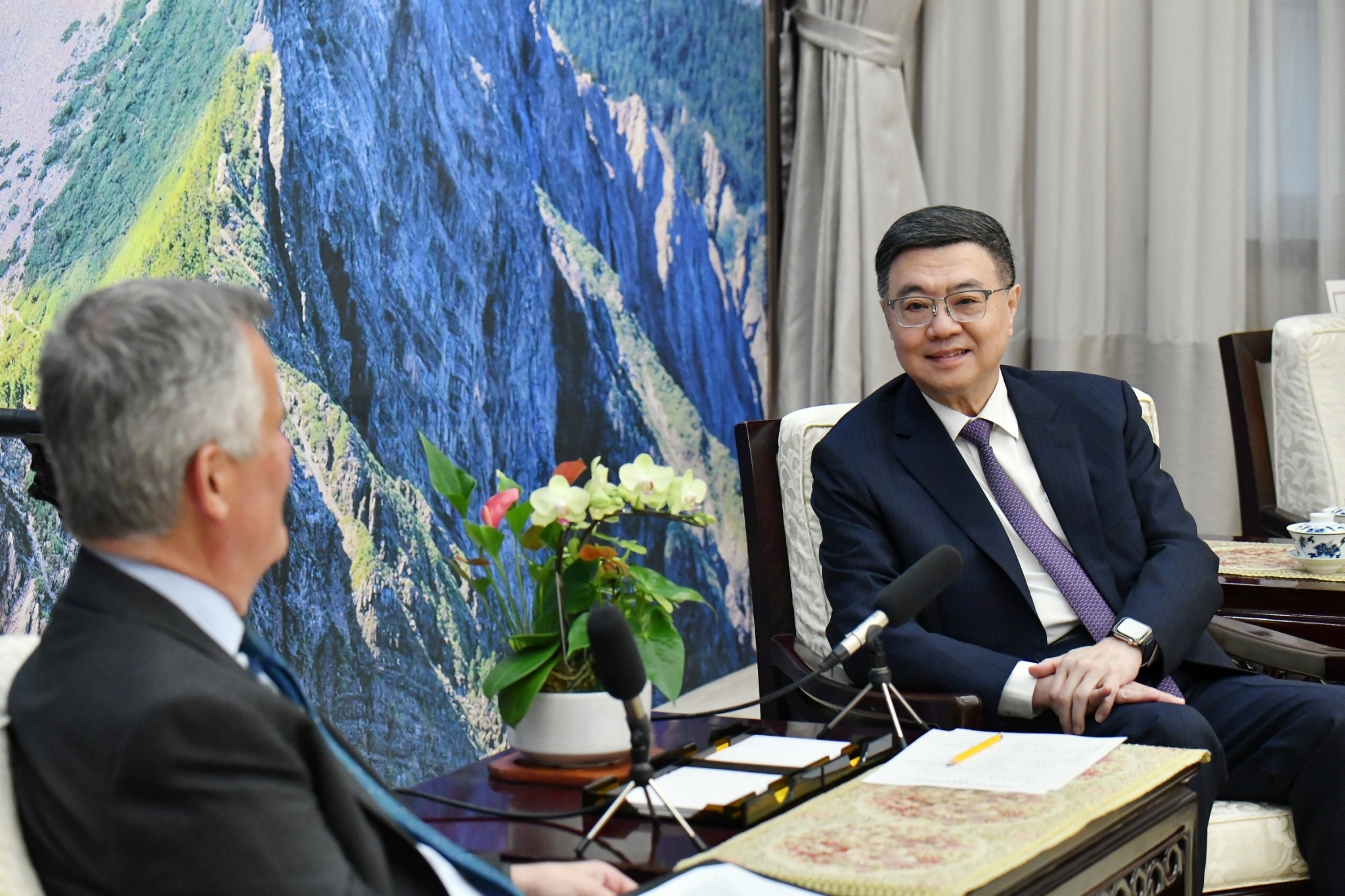 訪賓一行由外交部次長吳志中陪同,前來行政院拜會卓院長,行政院政務委員楊珍妮、代理發言人謝子涵、經濟部次長陳正祺也在座。