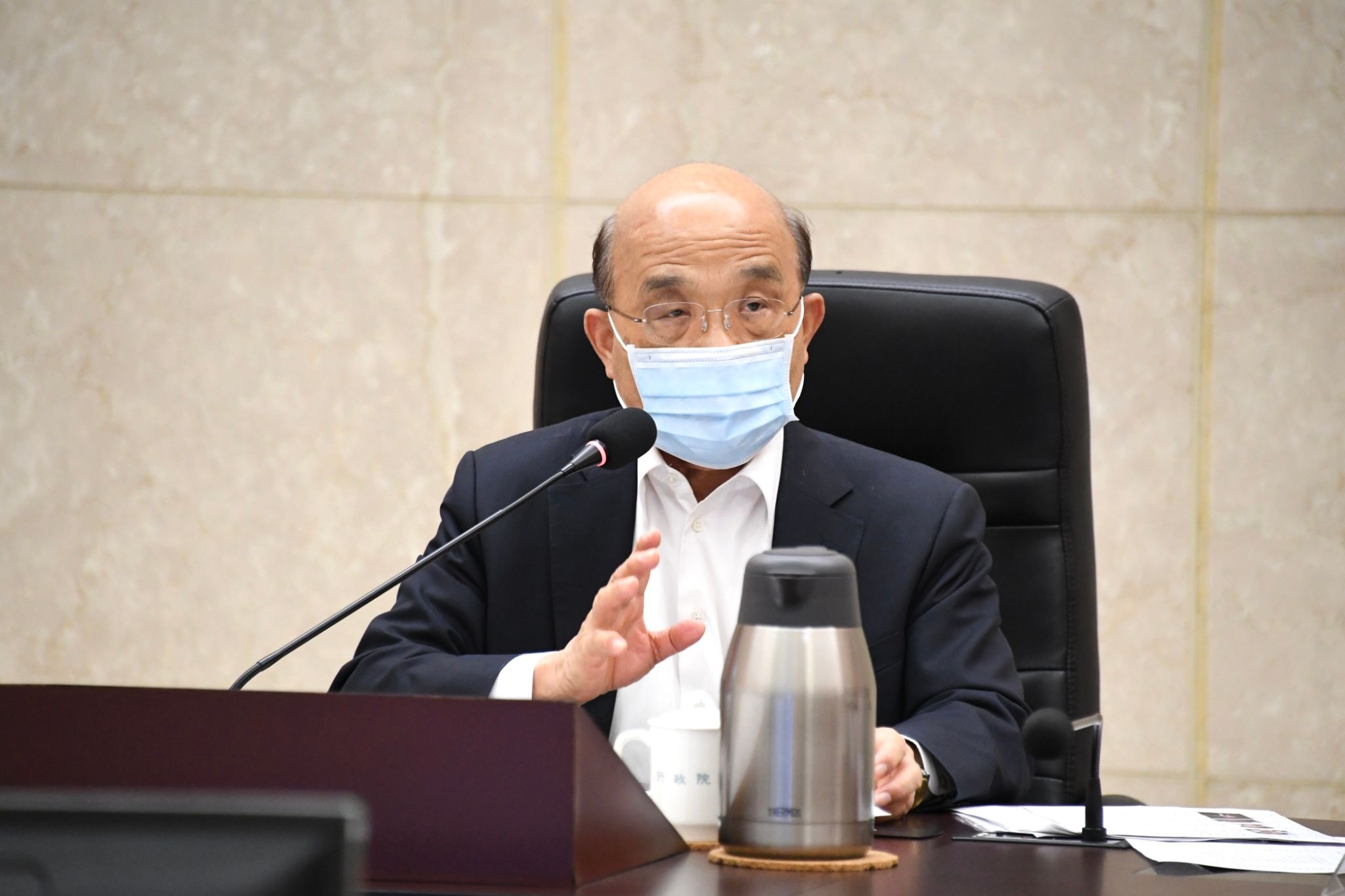 蘇院長在聽取「強化海洋污染緊急應變機制」報告後表示,中油大林煉油廠在2號浮筒蛇管漏油事件中,海委會並非只擔任監督、偵測跟處罰,應該積極介入,在事件發生的第一時間就把油污攔起來,避免油污擴散。而這次漏油事件中,中油等相關單位在標準作業流程、器材維護及通報機制都發生問題,檢討報告不應流於形式,必須直接面對問題,勇敢承認錯誤,針對問題提出解決方法。蘇院長也希望各部會發揮功能,相互合作,從中央到地方一同盤點海上輸油之污染防治配套措施,以及海洋污染防治相關的設施、機具等,針對問題做好相關工作。