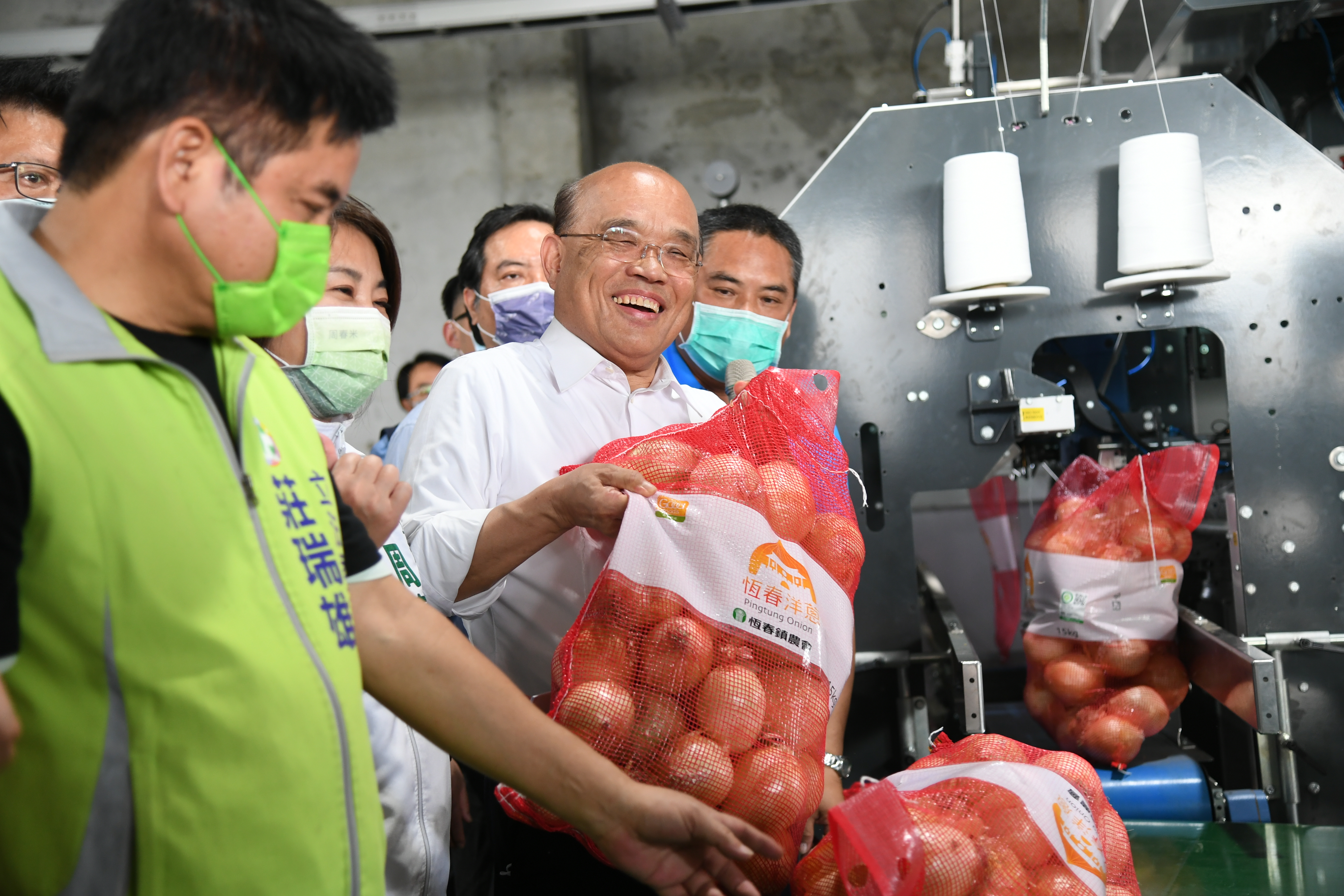 蘇院長表示,近來洋蔥受到天氣、病害等因素影響,使得產量減少、價格下跌,他已指示農委會陳吉仲主委協助,並提供恆春洋蔥冷鏈中心、有機質補助、土壤改良、改良場專家協助及設施設備補助等五項措施。院長說,感謝在地立委的關心及幫忙,現階段要穩定洋蔥價格及產量外,並請農委會在其他方面給予協助,像是他已核定84億經費提升冷鏈設備的技術,或在採收機器配給增加、其他專案補助等,要讓臺灣農產品可以與世界競爭。對於外界指出受損害的洋蔥已符合「農業天然災害救助辦法」,質疑屏東縣政府扣發補償金的不實傳言,對此,蘇院長也為潘孟安縣長澄清並說明由於近來天候異常,農民若有損失,中央會想辦法補助,多照顧鄉親,也請鄉親多給農委會陳主委鼓勵及體諒。