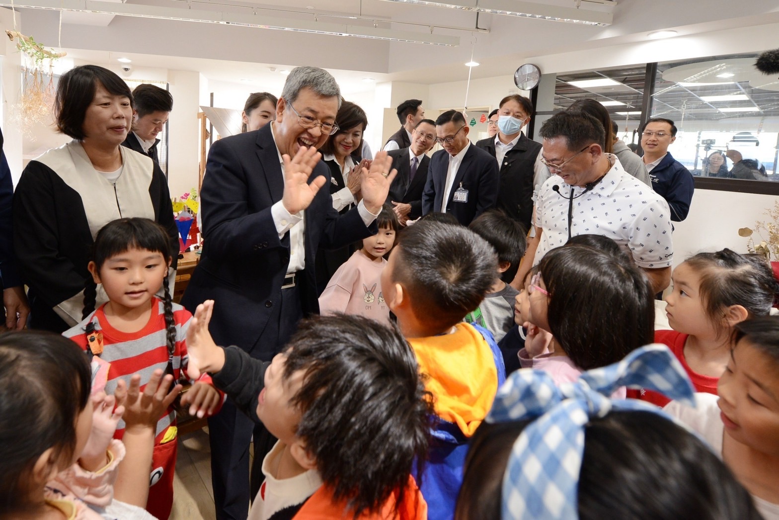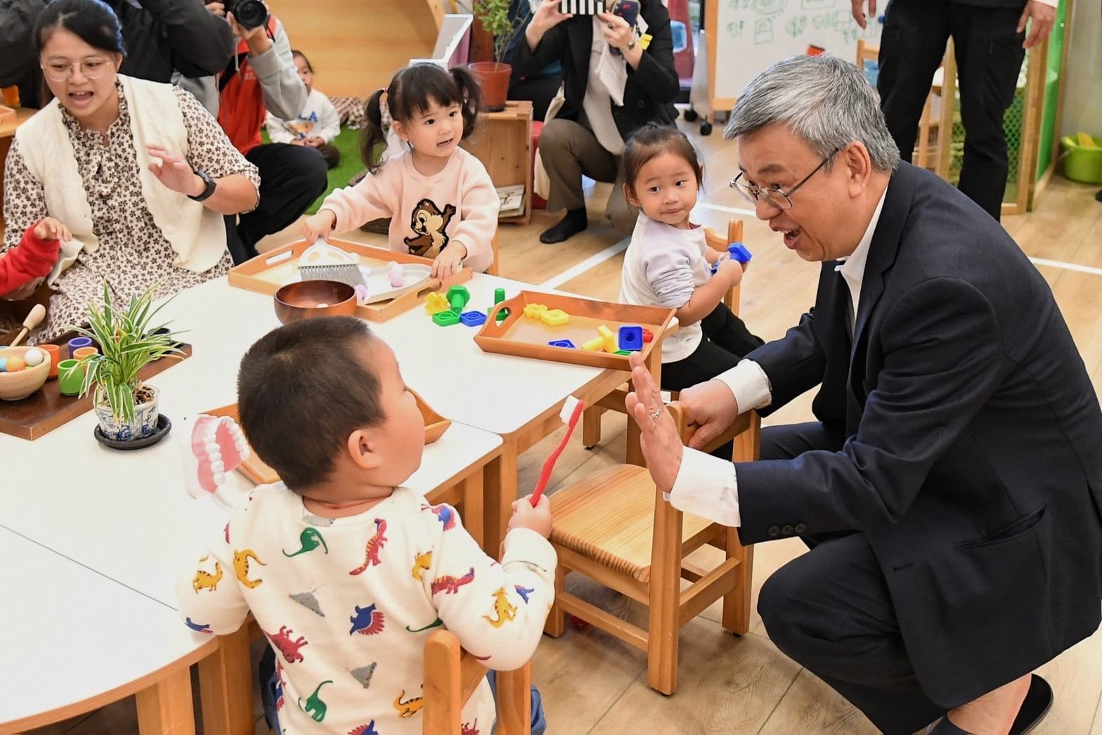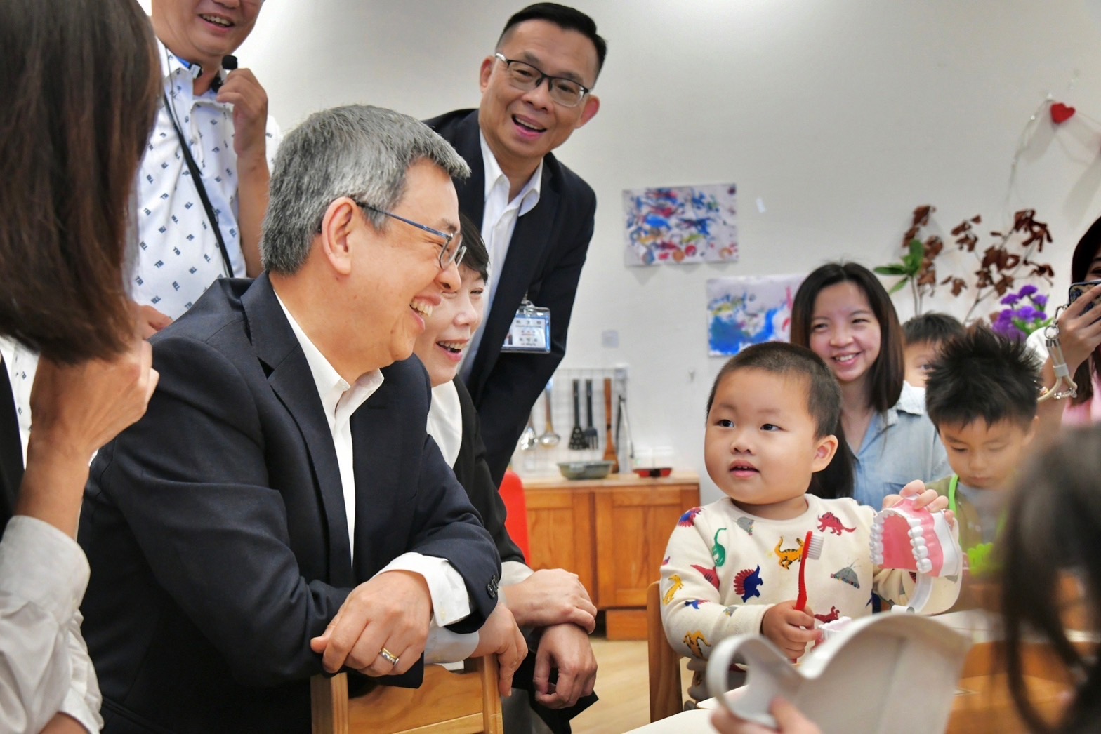 陳院長到場後,首先聽取基隆市政府教育處謝仲威科長說明「點亮等待父母下班的溫馨陪伴」簡報,並於致詞結束後,由鄭世儀園長引導分別至1樓及3樓教室內參觀幼童上課情形。院長也與幼童親切互動,並為3位11月生日的幼童慶生,眾人合唱生日快樂歌後切下蛋糕,氣氛和樂融融。最後,院長與教育部林明裕次長、基隆市邱佩琳副市長、教育處楊桂杰代理處長、基隆市議會童子瑋議長、張顥瀚議員、許睿慈議員、陳宜議員、鄭文婷議員、陳軍佐議員、施偉政議員、基隆市正濱國中林世傑校長、鄭園長及幼童等人於教室內合影留念,場面溫馨愉快。