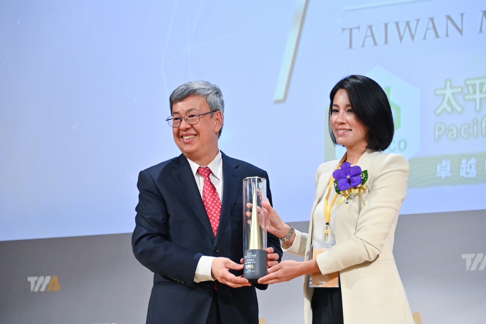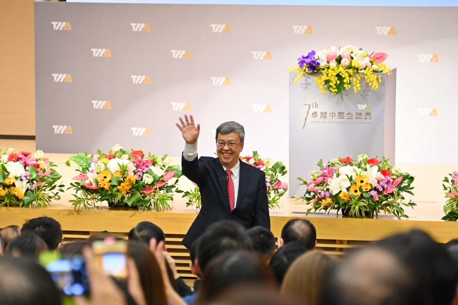 陳院長到場後,首先與現場貴賓一同觀賞卓越中堅企業獎介紹影片;致詞結束後,院長在各企業應援團的口號歡呼聲中,逐一頒發「卓越中堅企業獎」獎座予10名得獎企業代表,以及頒發「營造友善職場優良中堅企業獎」證書予2名得獎企業代表,並偕同行政院林子倫發言人、經濟部王美花部長及產業發展署連錦漳署長與12家獲獎企業代表合影留念。