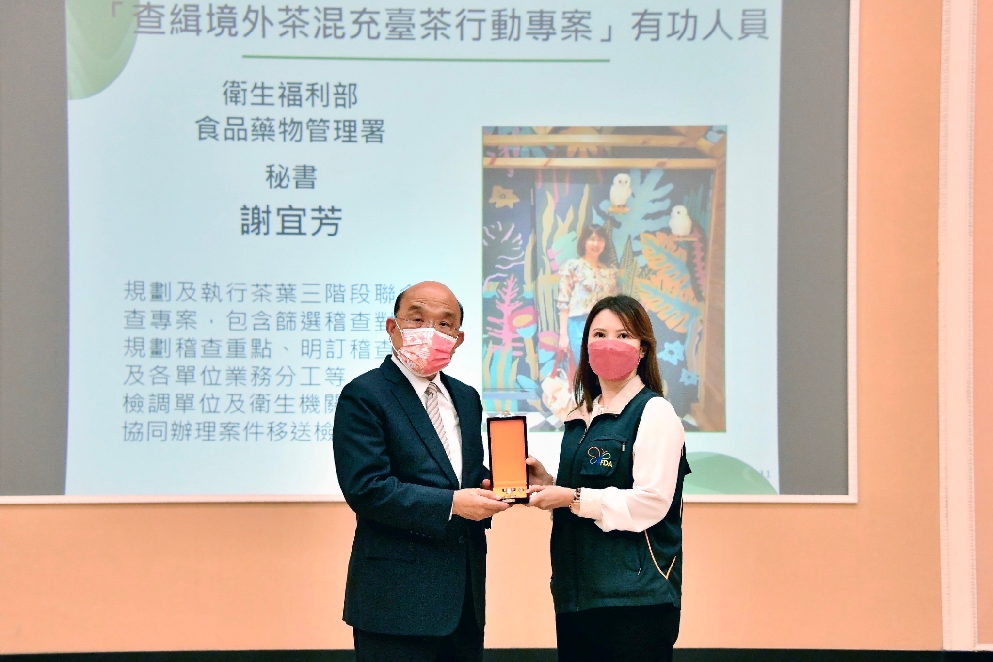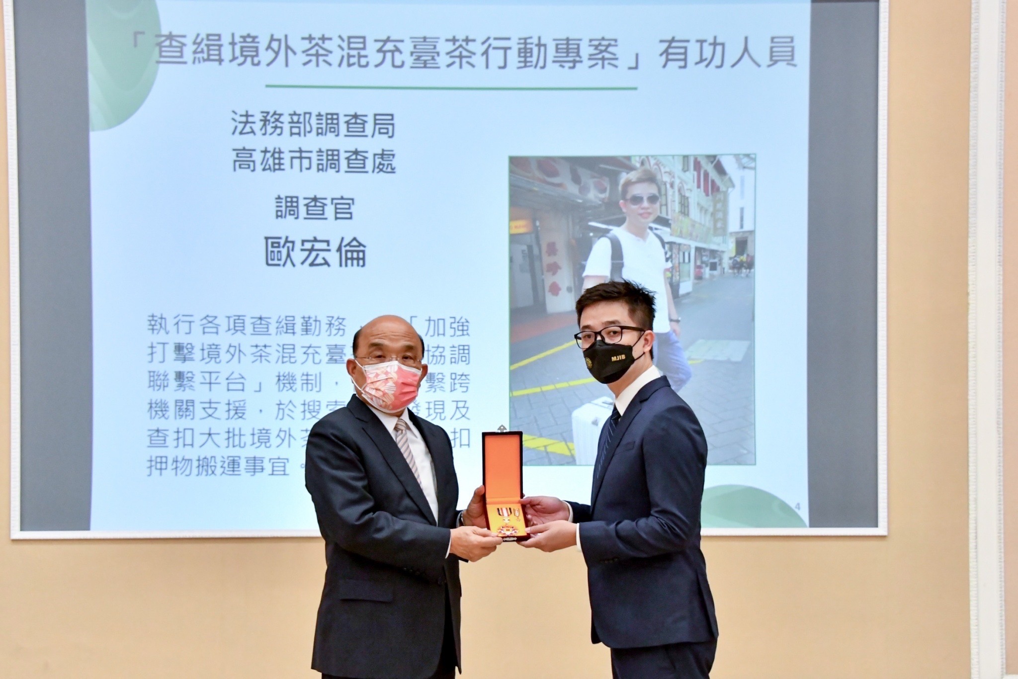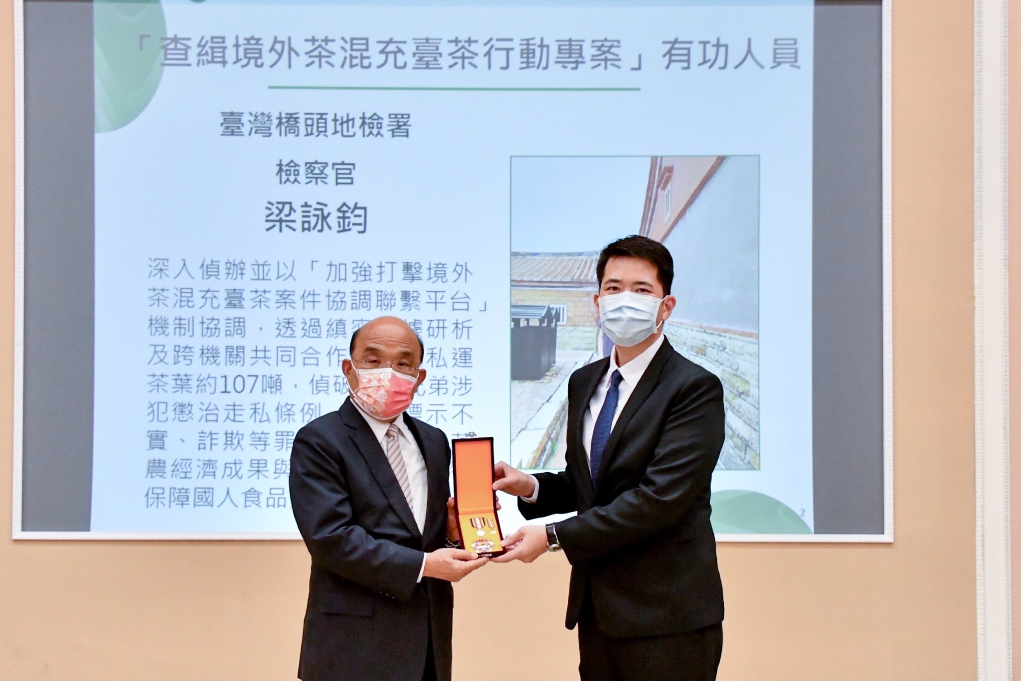 蘇院長非常重視捍衛食品安全第一線同仁的努力與付出,10月15日他即前往高雄市南區大型贓證物庫視察「111年度查緝境外茶混充臺茶行動專案成效展示」,並慰勉有功人員,而今日他在食安會報開始前,更親自頒發三等功績獎章予臺灣橋頭地方檢察署、法務部調查局高雄市調查處、行政院農業委員會茶業改良場、農糧署南區分署高雄辦事處、衛生福利部食品藥物管理署及財政部關務署高雄關等12名有功人員,表彰他們透過跨部會合作、提出創新檢驗方法、落實溯源查緝,破獲史上最大量近6,000箱、107公噸的走私混摻茶,是真正會做事的基層同仁,殊值嘉許。蘇院長也強調,他已交代人事長及相關部會首長還要再對有功人員專案敘獎,一定要給予最實質的獎勵。