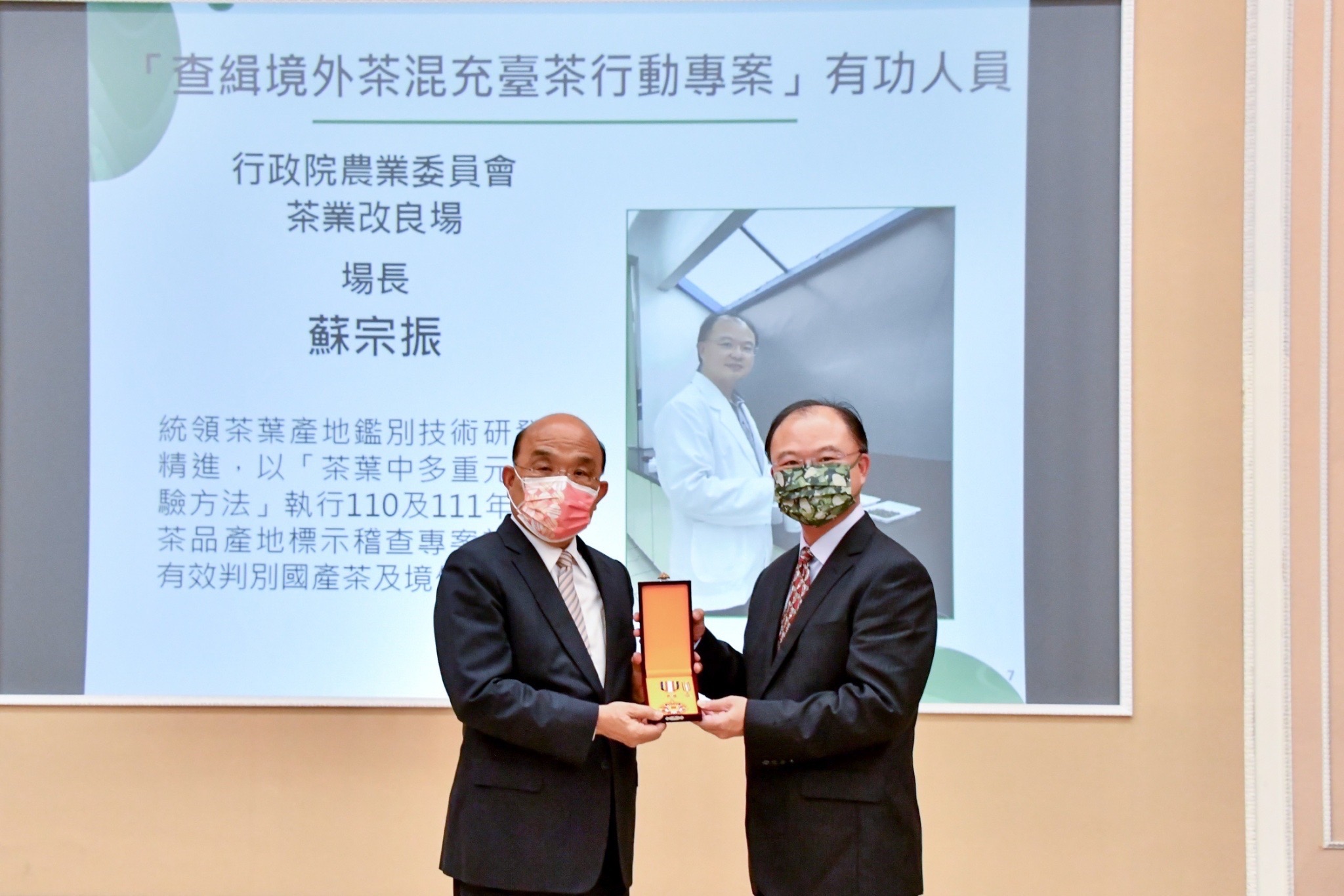 行政院長蘇貞昌今(31)日主持「行政院食品安全會報111年第3次會議」,並於會前親自頒發三等功績獎章予12名破獲史上最大量107公噸走私混摻茶的有功人員,表彰楷模,嘉勉肯定。蘇院長表示,行政院農業委員會已公告自明(2023)年元旦起在地產製的國產茶,都應提供產銷履歷標示、QR Code或有機標章其中之一,請有關部會妥為宣導,為國人健康把關,並比照此次檢驗混摻茶的方法,持續精進研發各項檢驗判別技術,以應用於部分容易被進口或走私貨品混充的優質臺灣農產品,並落實商品標示與食安管理;另對於進口食品輸臺,也請衛福部等相關部會持續精進進口食品檢驗方法,提升檢驗能量,擴大檢驗項目,將不合格產品阻於境外,保障國人食品安全。