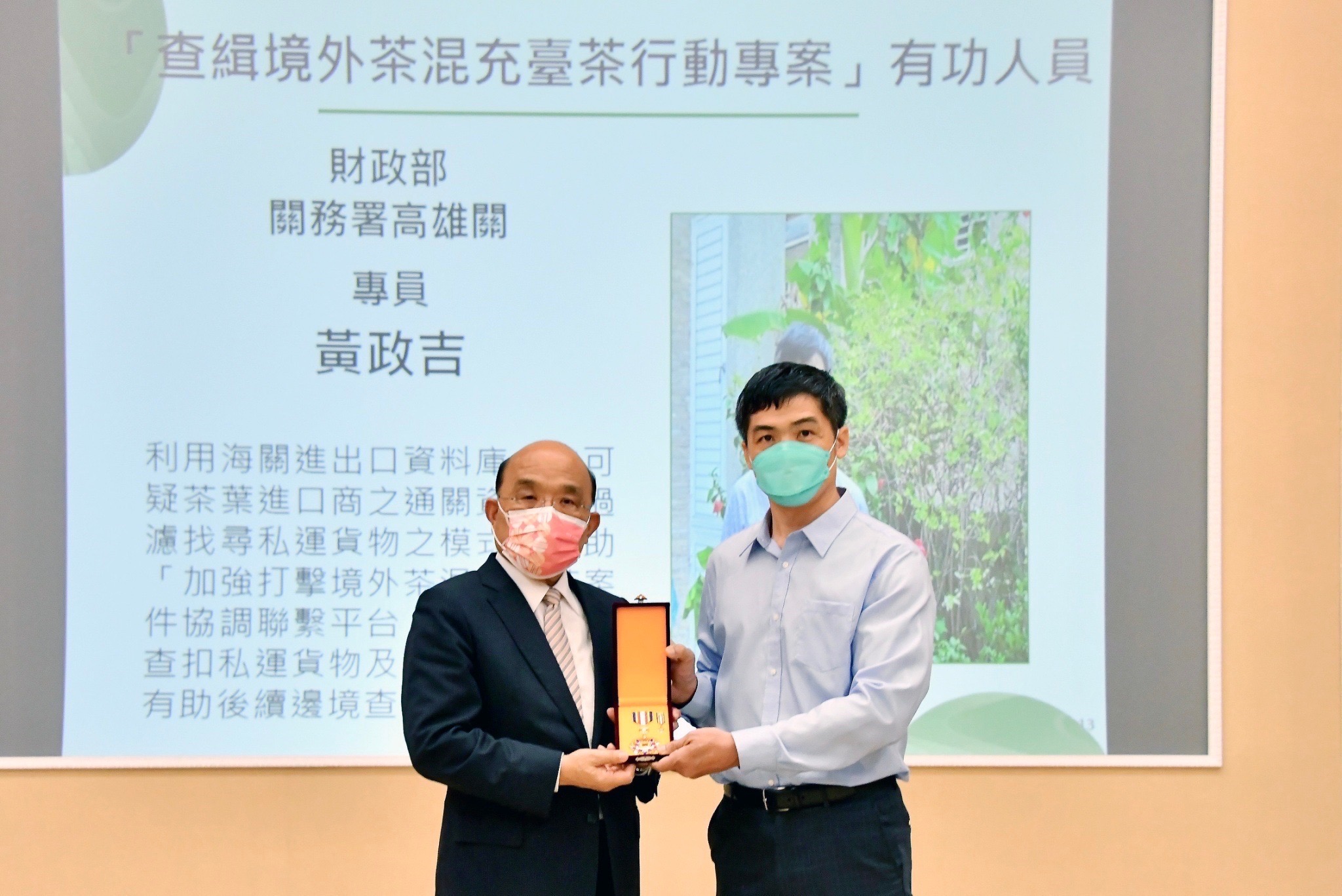 蘇院長指出,今天12名受獎代表皆為打擊混摻茶最重要的第一線同仁,包括:農委會茶業改良場研發「茶葉中多重元素檢驗方法」,能有效判別國產茶及境外茶,準確率高達98%,並配合原本驗DNA(核酸檢測)及感官品評等方式可更有效精確判別;衛福部食藥署加快通過此檢驗法;財政部運用海關資料庫大數據掌握走私茶葉的模式;法務部臺灣高等檢察署運用打擊混摻茶聯繫平臺,整合各部會、中央及地方的力量,而承辦的檢察官與調查官均積極偵辦搜證、向上溯源,蘇院長表示,他們每一位都在自己的崗位上發揮專業、盡心盡力,守護國人食安,保衛臺灣茶產業,他要代表政府與人民向這些受獎代表致上最高的謝意。