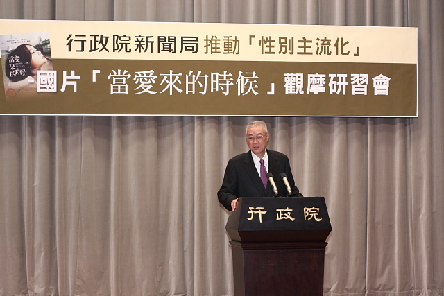 吳院長今天出席由行政院新聞局所舉辦,推動性別主流化國片「當愛來的時候」觀摩研習會時作上述表示。他同時感謝行政院婦權委員會同仁的努力,讓政府部門能把性別主流化當成重要的工作,尤其在世界人權日的今天觀賞這齣張作驥導演2010年最「感心」的電影,女性同仁一定能夠感覺到政府的用心。