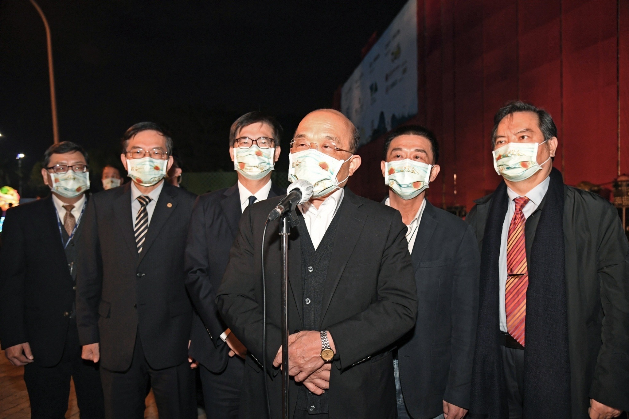 隨後,蘇院長與蔡總統及陳其邁市長等貴賓一同將手置於開燈啟動臺上,在民眾倒數歡呼聲中,共同完成開燈儀式,並一同欣賞主燈「鳳彩飛舞」展演,絢麗奪目的燈光不斷映入眼簾。開燈儀式結束後,總統、院長、陳其邁市長也步行至祈福燈樹下,並分別於「福佑臺灣」、「虎力平安」、「虎力雄旺」祈福語的電子屏幕上簽名,祝福臺灣燈會圓滿成功。
