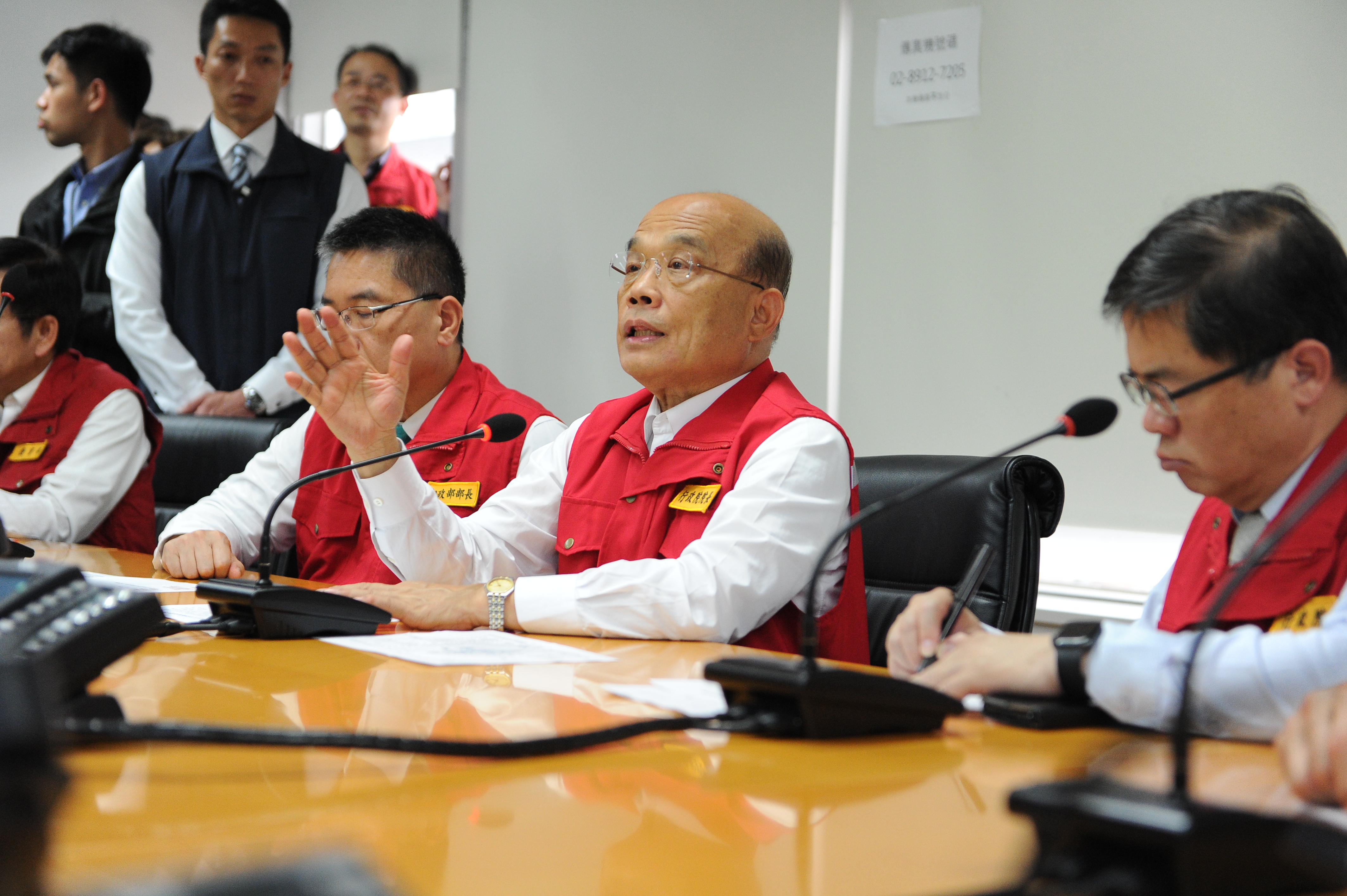 蘇院長指出,依據目前災情回報,教育部所屬學童、教師及工作人員均無傷亡;電力、水利等基礎設施均無災損;高鐵台北至桃園段短暫停駛檢修後,已回復運載;台北市捷運經檢修後,也已回復行駛,其他海、陸、空交通運輸系統均無災損;至於位在台北市長安東路的傾斜大樓,人員均已撤離,並管制出入。