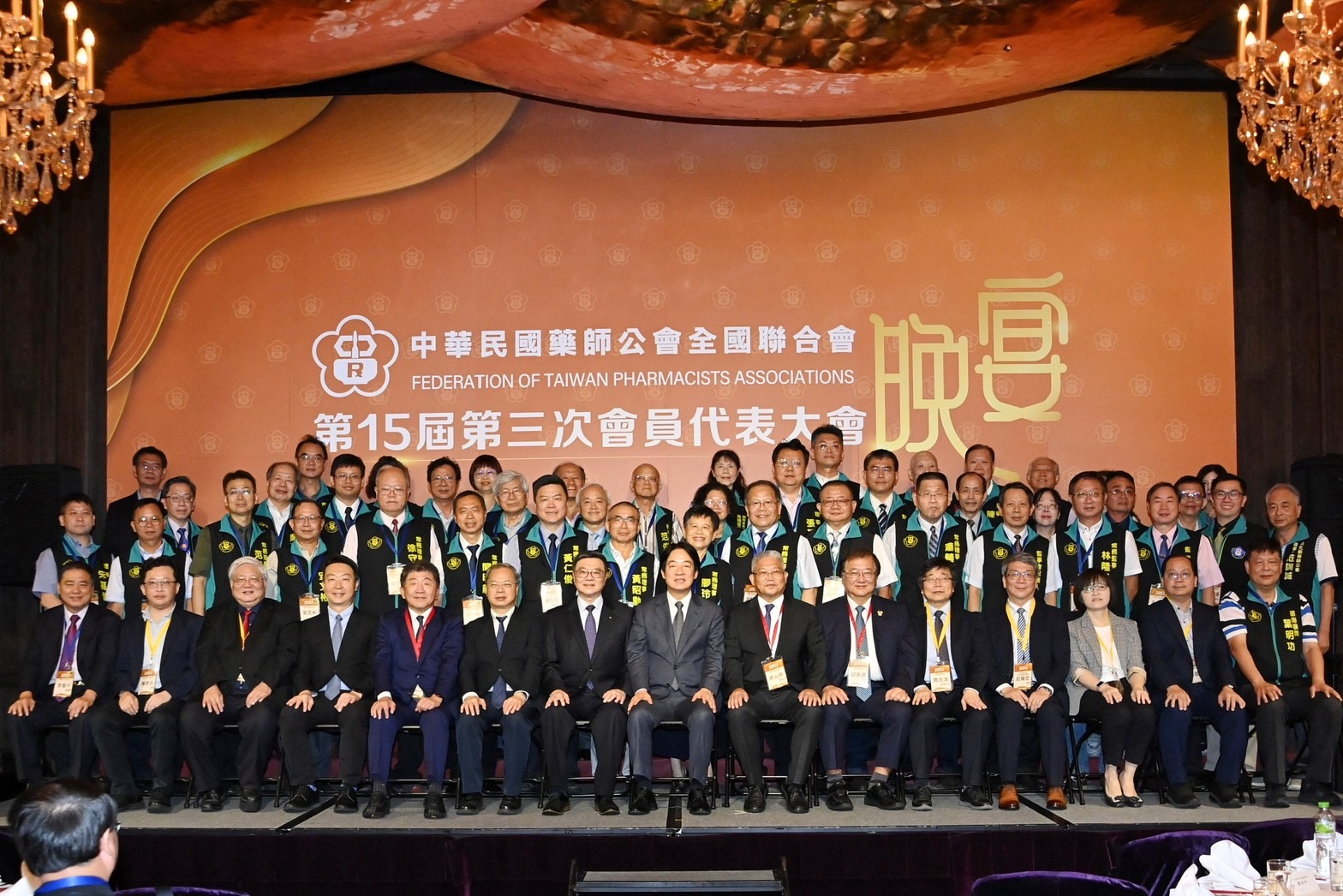 致詞結束後,賴清德總統、卓榮泰院長、行政院陳時中政務委員、龔明鑫秘書長、陳世凱發言人、衛生福利部邱泰源部長、周志浩次長、醫事司劉越萍司長、綜合規劃司廖崑富司長、食品藥物管理署莊聲宏署長、國民健康署吳昭軍署長、臺北市衛生局陳彥元局長、中華民國藥師公會全國聯合會黃金舜理事長、李蜀平總顧問及理監事團隊等合影留念。