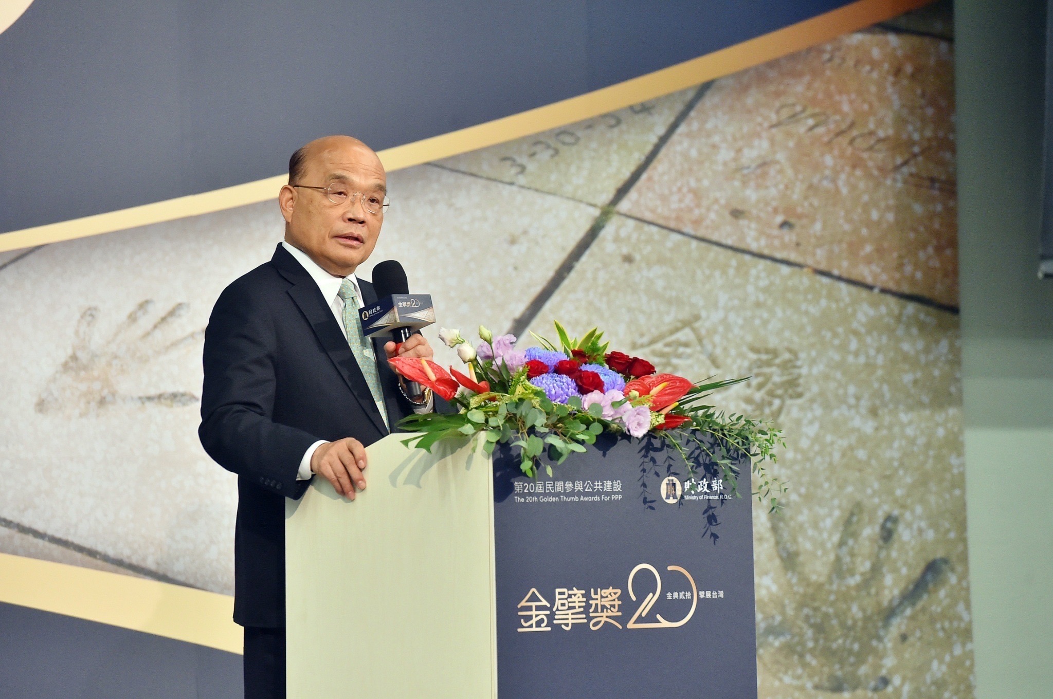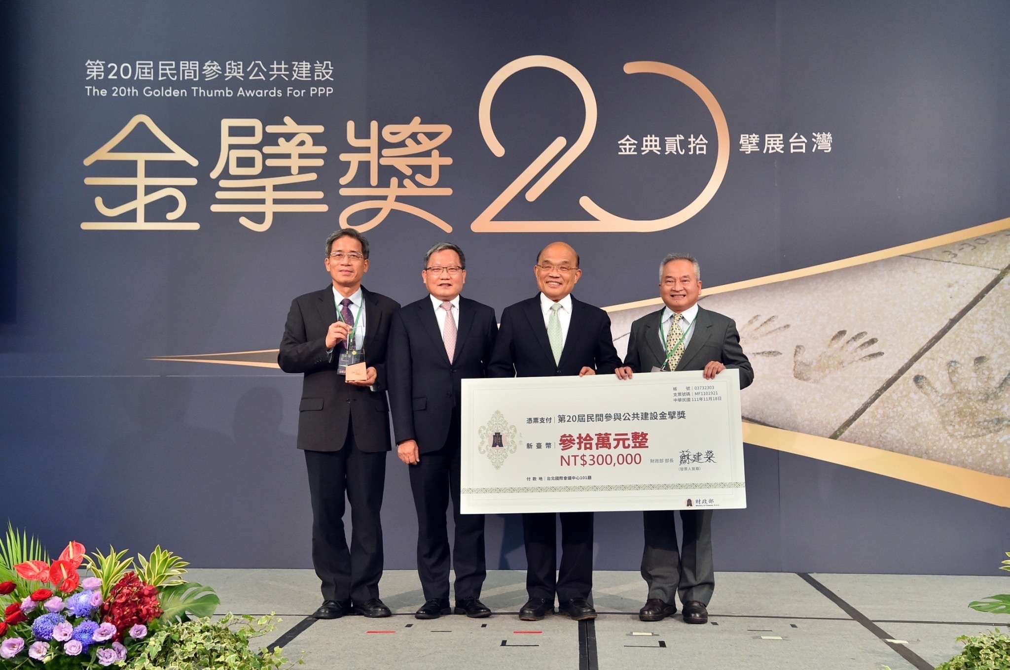 行政院長蘇貞昌今(18)日出席「第20屆民間參與公共建設金擘獎頒獎典禮」時表示,「促進民間參與公共建設法」(促參法)施行迄今已22年,感謝政府團隊透過政策引導方式,擴大民間參與投資,也感謝所有參與金擘獎的評審委員選出許多優良促參案件,20年來全國已執行逾1,500件促參案,民間投資金額高達近9,300億元,並節省政府財政支出逾1兆6千多億元,成果豐碩。蘇院長也舉「新北市中和區保二總隊公辦都更案」、「屏東榮民總醫院興建案」以及他擔任臺北縣長時推動的雙和醫院興建案為例,強調促參法的推動,正是政府訂出辦法,讓民間願意相信政府,促成公私一起協力,完成多項重大建設的具體例證,並指示財政部持續擴大促參誘因,激發民間參與公共建設投資的動能,讓臺灣更好。