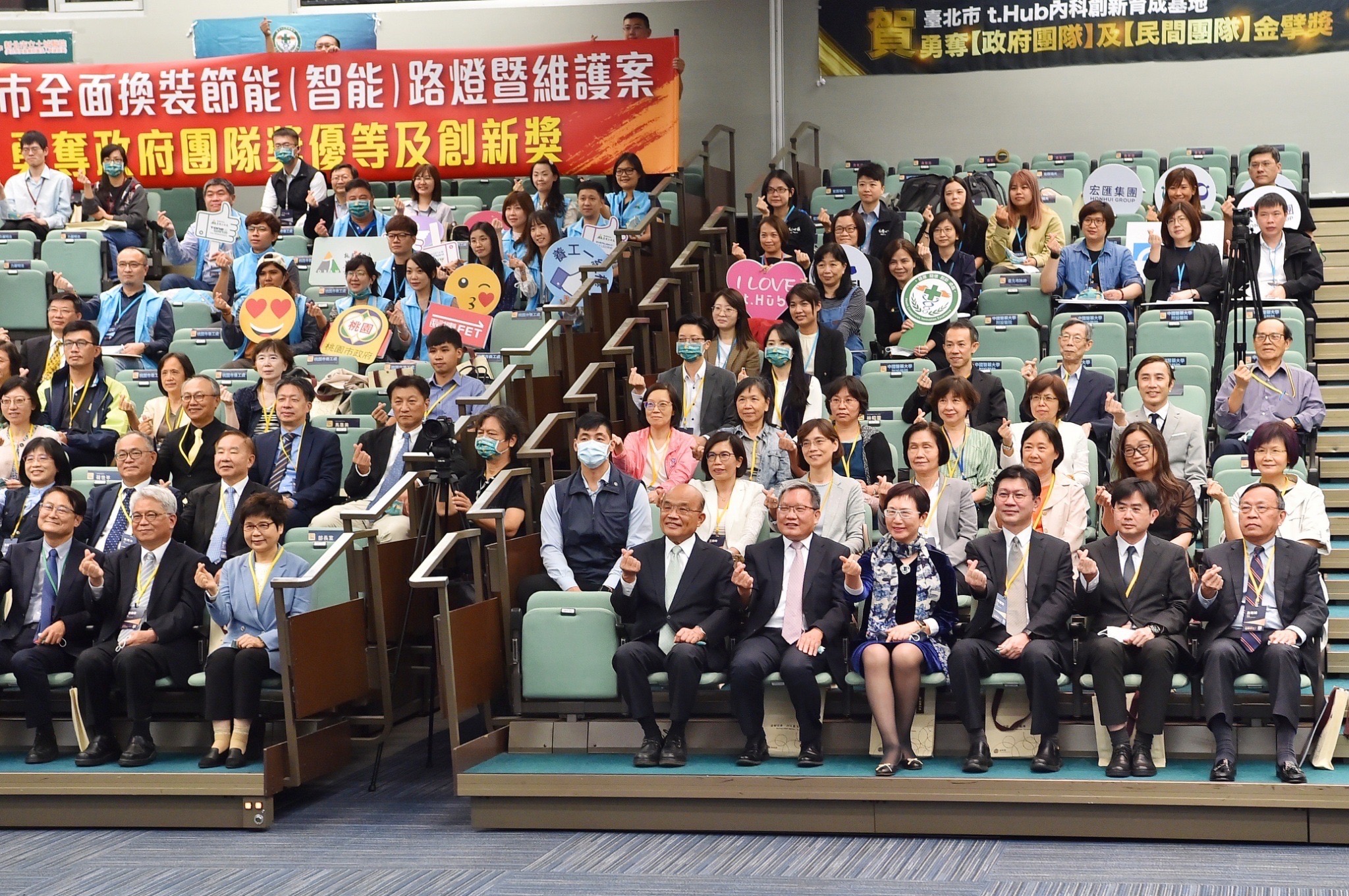 此行蘇院長蒞臨後,先與全場貴賓及得獎團隊於座位上一同比讚合影,隨後欣賞小貝殼工作坊帶來的烏克麗麗開場表演,並觀賞獲獎團隊介紹影片;致詞結束後,蘇院長親自頒獎予得獎團隊,包括政府團隊獎4件及民間團隊獎6件,並逐一與得獎團隊合影留念,各團隊的啦啦隊也在臺下高喊隊呼,場面十分熱絡。