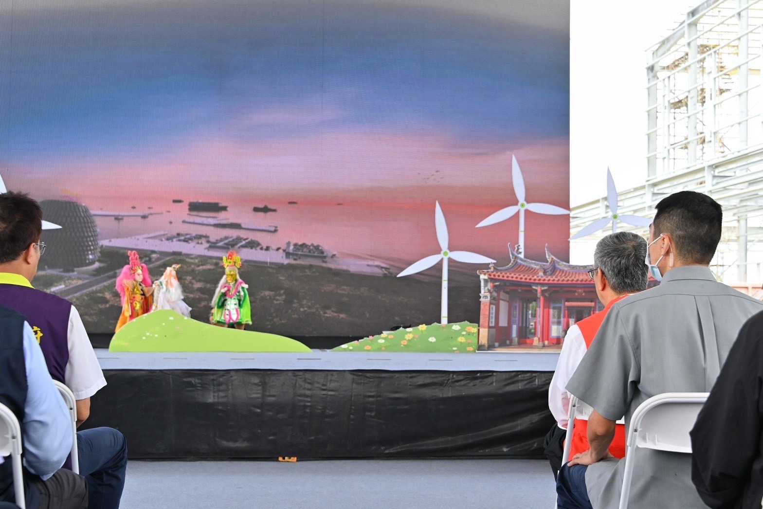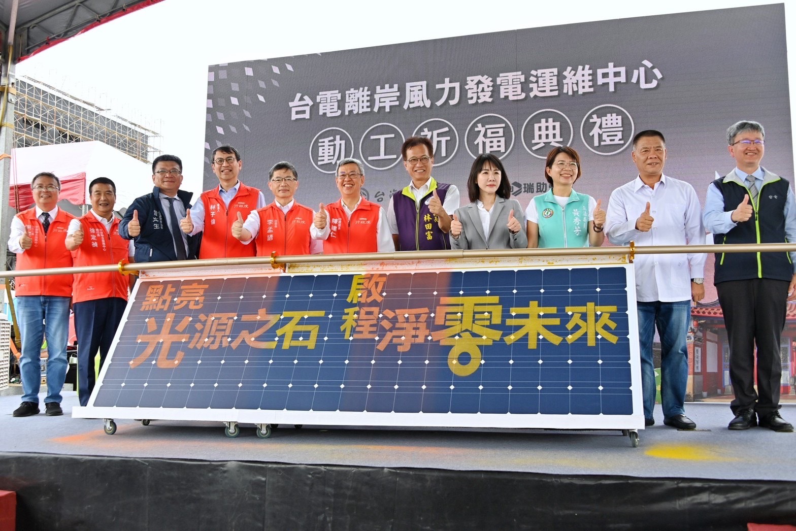 此行,陳院長蒞臨後,首先欣賞布袋戲開場表演,並觀看「MVRDV(荷蘭建築師事務所)設計說明影片」,了解台電離岸風力發電維運中心的規劃設計。致詞結束後,陳院長與行政院李孟諺秘書長、林子倫發言人、經濟部曾文生次長、彰化縣林田富副縣長、許原龍副議長、謝衣鳯立委、黃秀芳立委、台電公司王耀庭總經理及瑞助營造謝文彥副總經理等人,一起進行祈福祝禱儀式,上香祈求工程順利;隨後一行人至舞臺上推動流沙啟動桿,流沙隨即向下滑落現「點亮光源之石 期程淨零未來」字樣,完成祈福儀式。