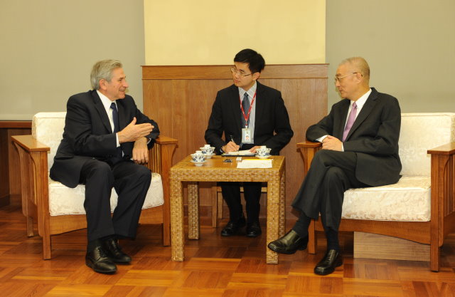 行政院長吳敦義今(19)日接見美台商業協會理事主席伍佛維茲大使一行時重申,馬總統所提出的兩岸和平協議沒有時間表,必須在兩岸累積一定的互信與善意,並確保我國主權完整與獨立,以及民意支持與國會監督的基礎上才會推動,而中國大陸也必須承認兩岸分治的現實,不再打壓我國國際空間,且放棄以武力解決的選項,兩岸和平協議才有水到渠成的一天。