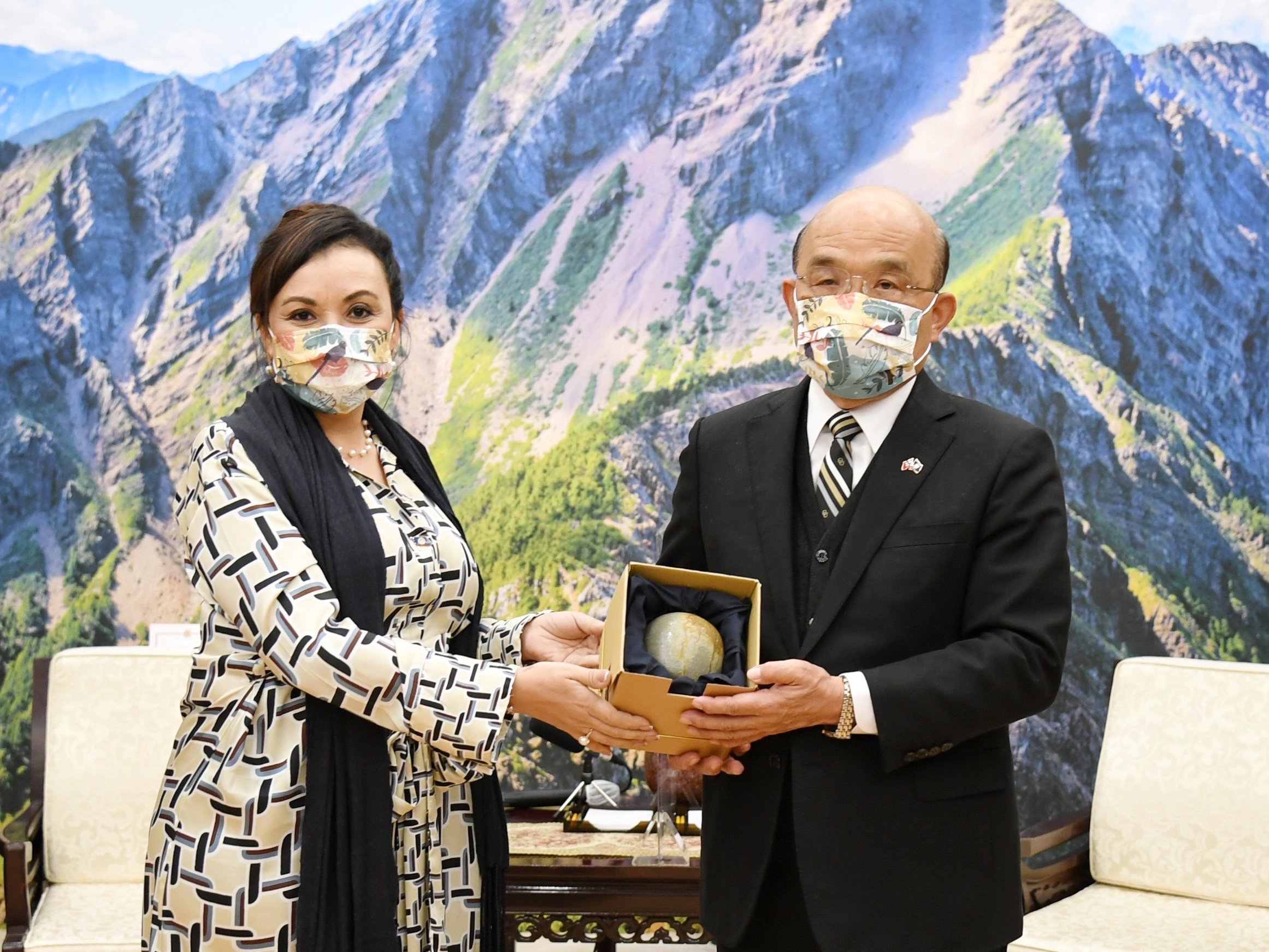 此行蘇院長致贈布里仙紐總理「海碧彩金 蝴蝶蘭花茶具組」;致贈羅莎娜總理夫人「柴燒灰釉花瓶」;致贈柯特尼部長、馮賽卡部長、麥伊部長「紅色四大名山頂級茶葉禮盒」,以及致贈萊斯利內閣秘書長、布海梅大使「醉美濃存 紅酒瓶塞及梯形琉璃底座」,雙方並合影留念。