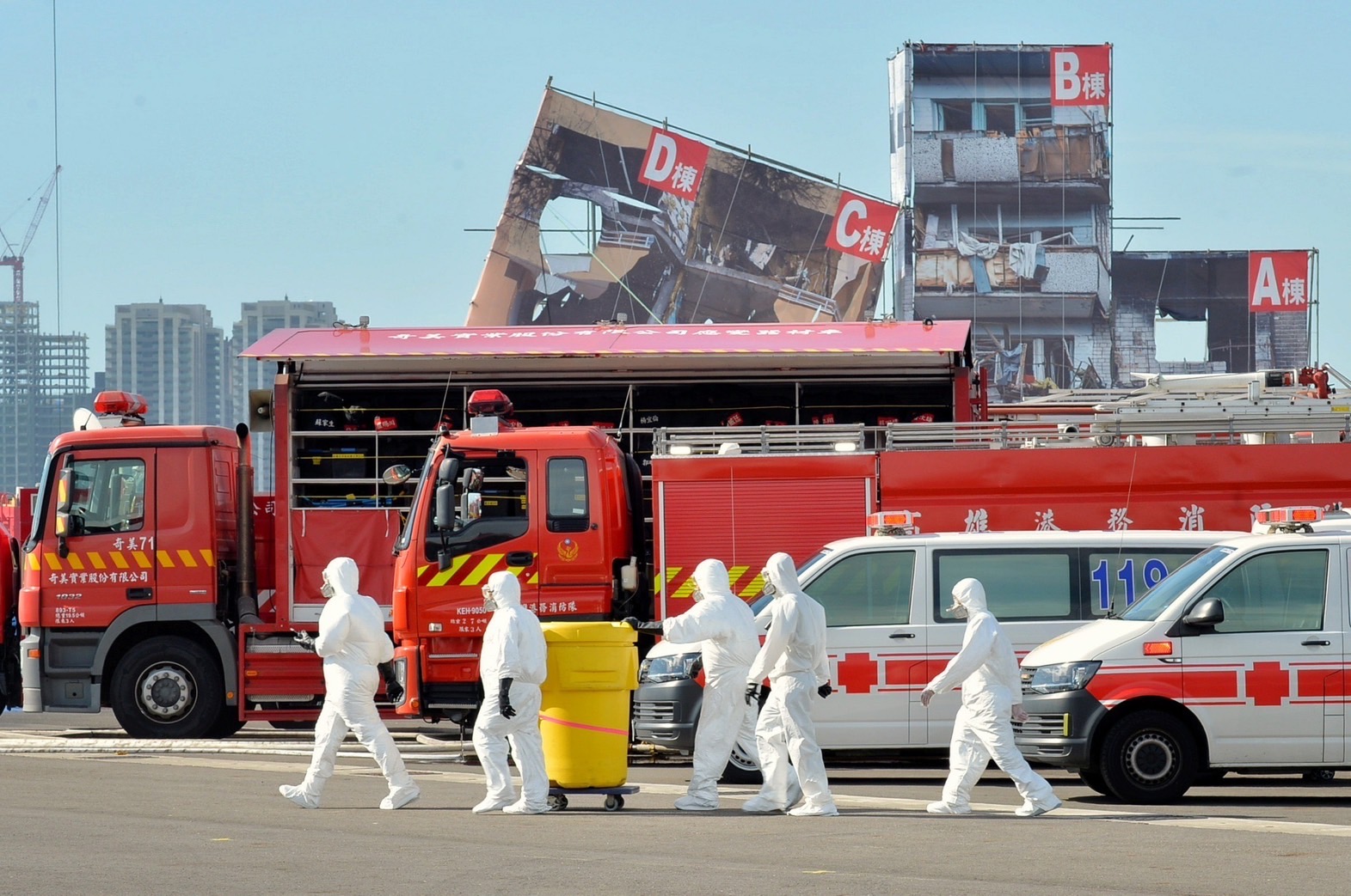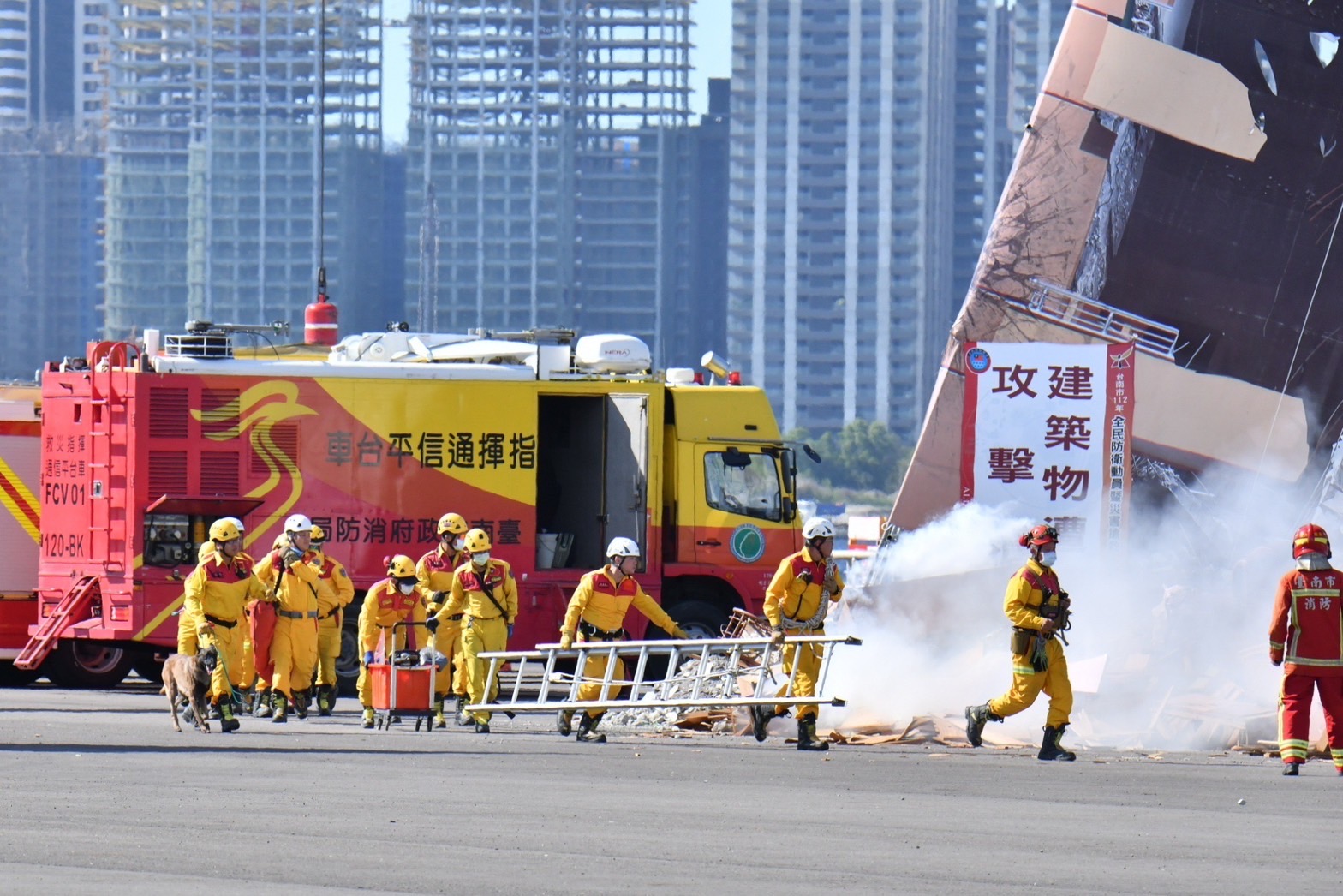 此行,陳院長到場後,首先現地視導綜合實作演練,包括市級及區級「聯合應變指揮管制中心」開設、召開防災整備會議、戰災及天然災後(風水災預警式)通報及相關災防單位整合運作、災前預警通報及相關災防單位整合運作、災害搶救等項目演練。致詞結束後,院長在國家安全會議顧立雄秘書長、行政院林子倫發言人、國防部邱國正部長、海洋委員會管碧玲主委、行政院環境保護署張子敬署長、臺南市政府黃偉哲市長等人陪同下,校閱慰問參演同仁,感謝他們的辛勞。