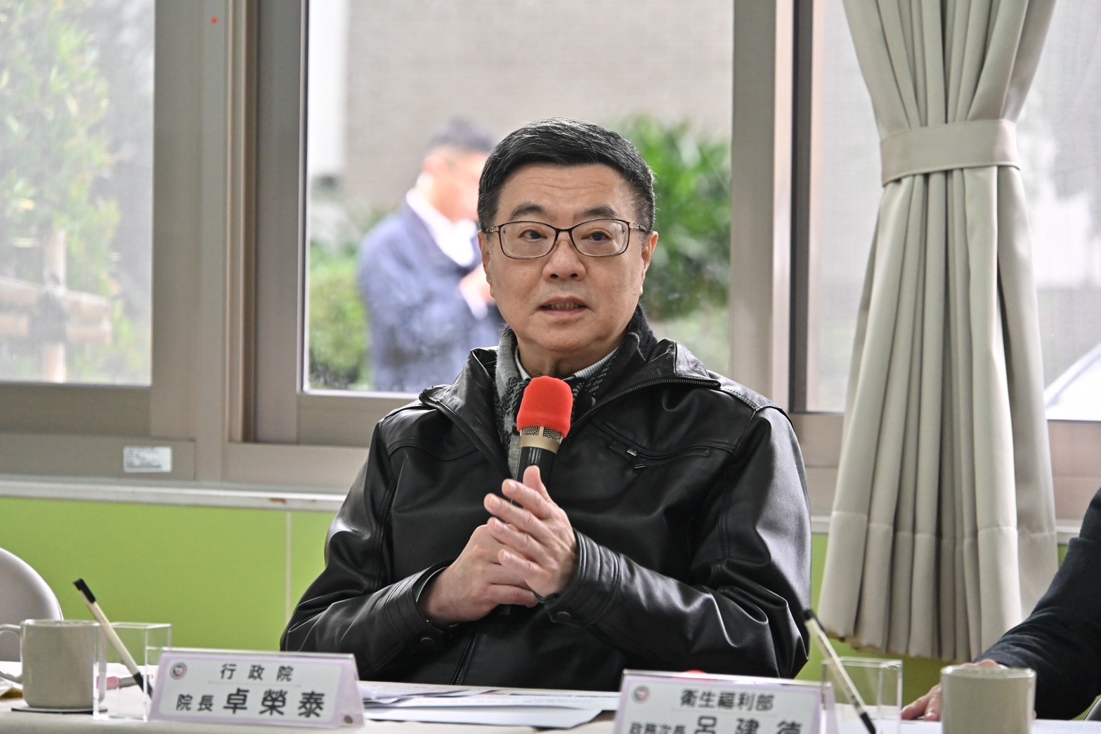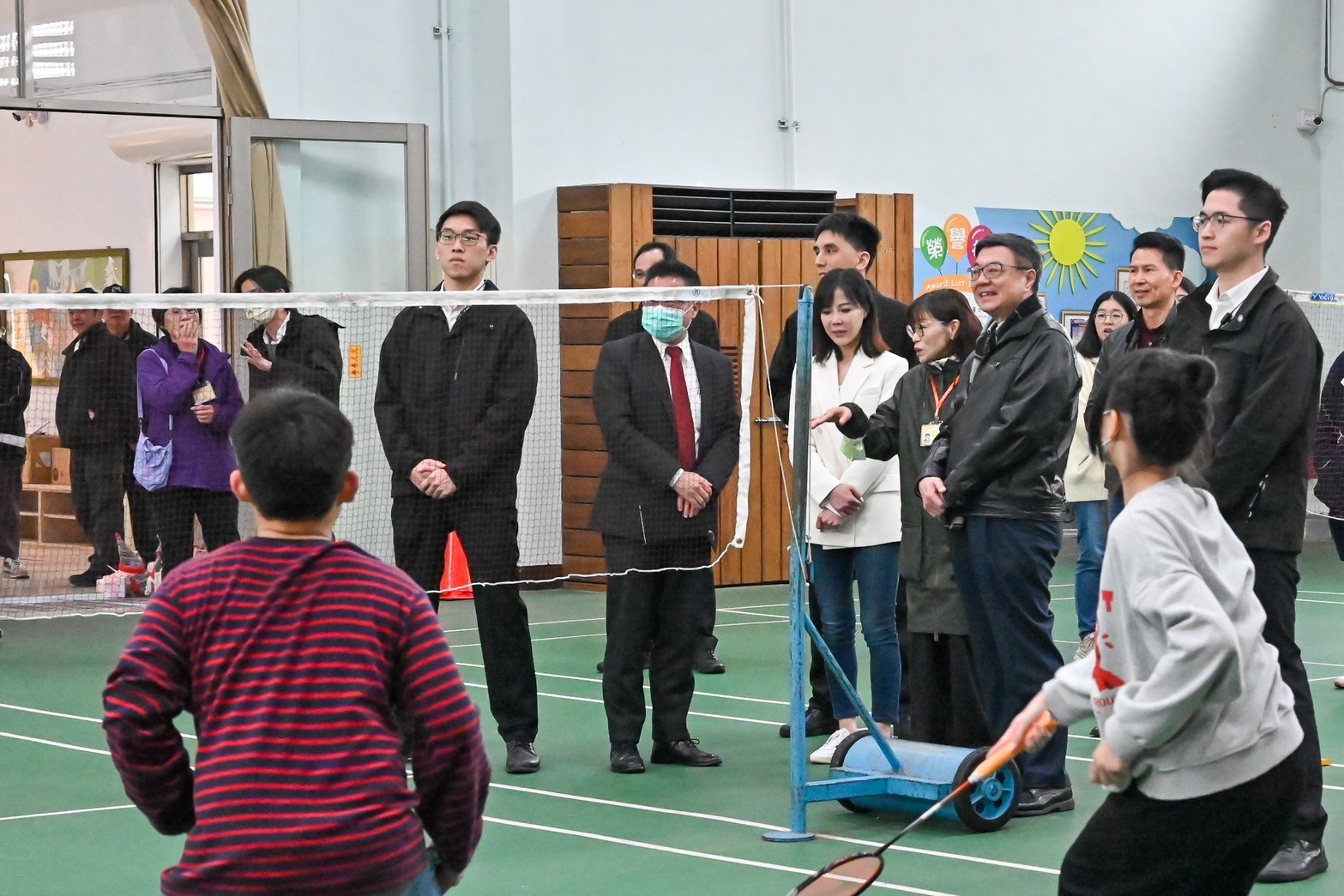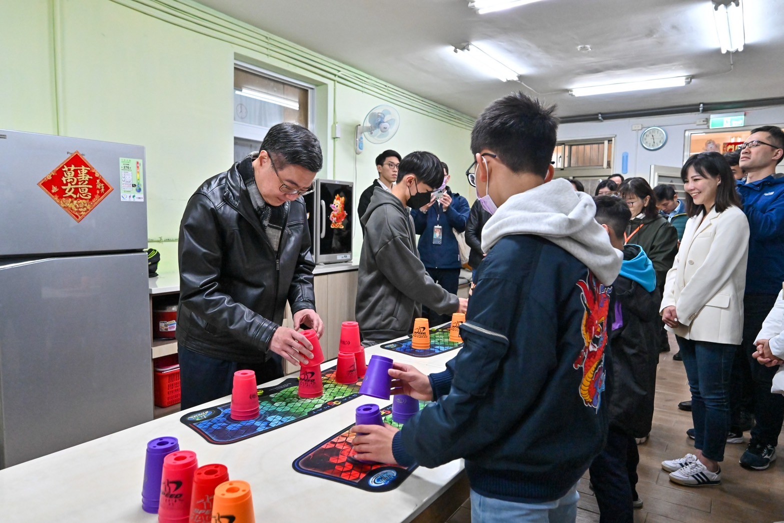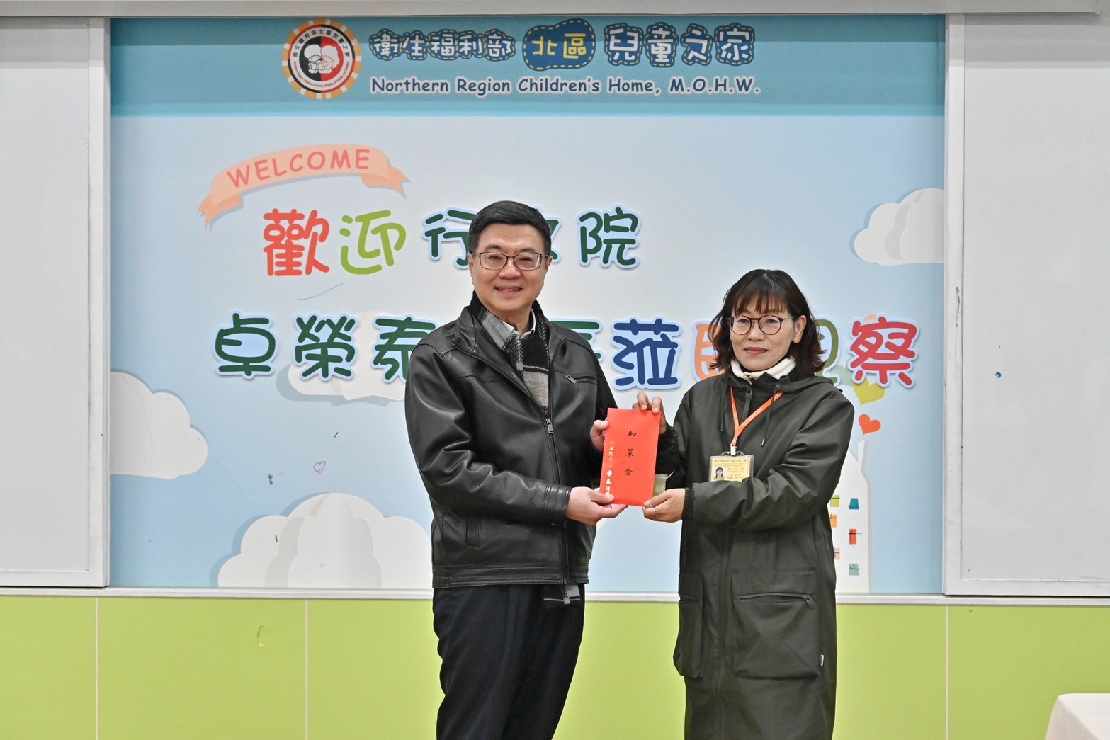 此行,卓院長首先聽取衛福部北區兒童之家黃貞容主任介紹機構概況,並於致詞結束後,接受3名家童代表致贈感謝卡,學童也提前預祝卓院長生日快樂。卓院長並致贈春節加菜金予北區兒童之家,由黃主任代表受贈。隨後,卓院長與行政院李慧芝發言人、衛福部呂建德次長、社會及家庭署周道君代理署長等人,一同參觀課輔教室、羽球場,以及起居場所「萌虎家」,與家童體驗疊杯活動,並欣賞機構走廊的家童畫作,沿途與家童溫馨互動。